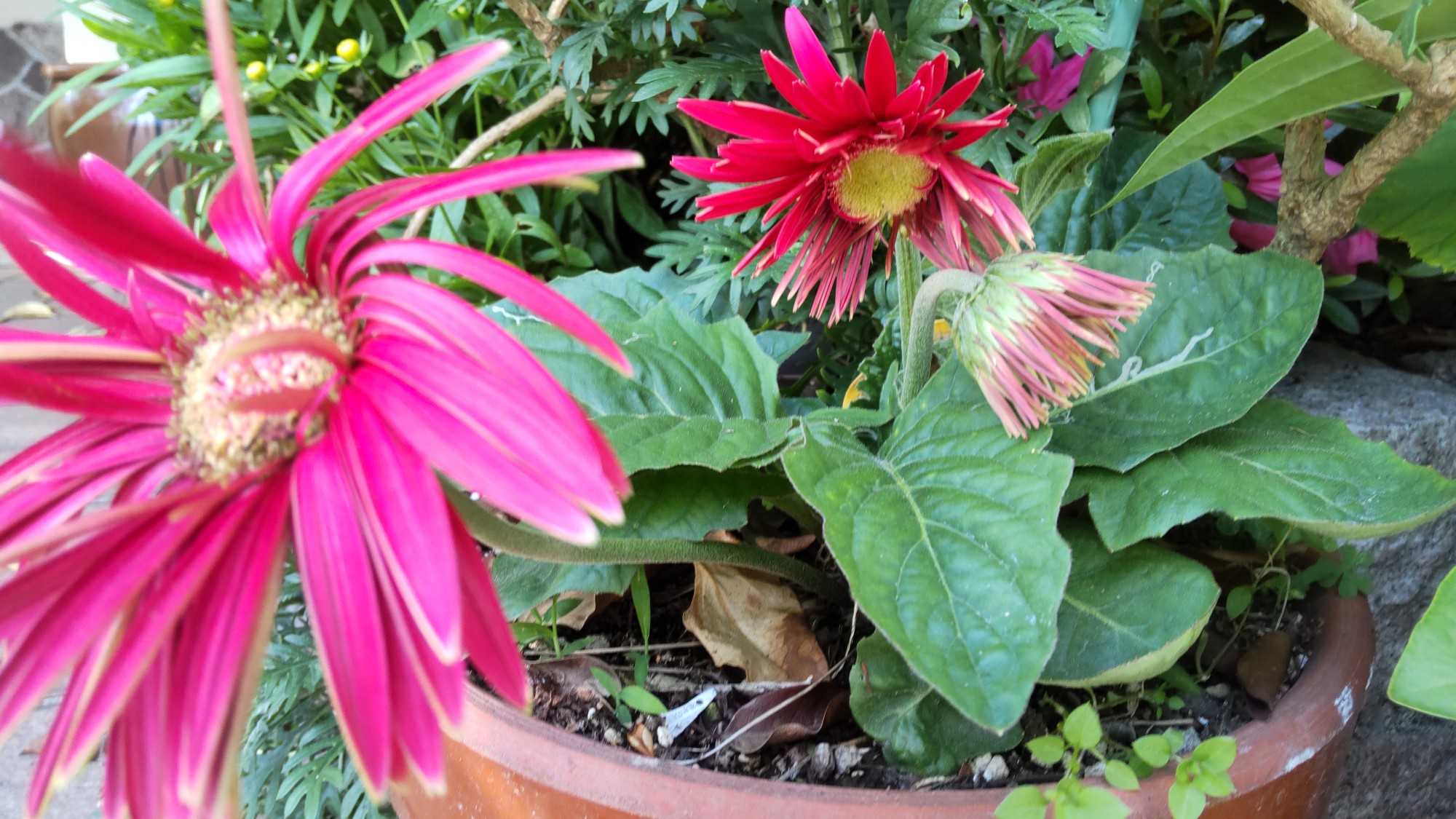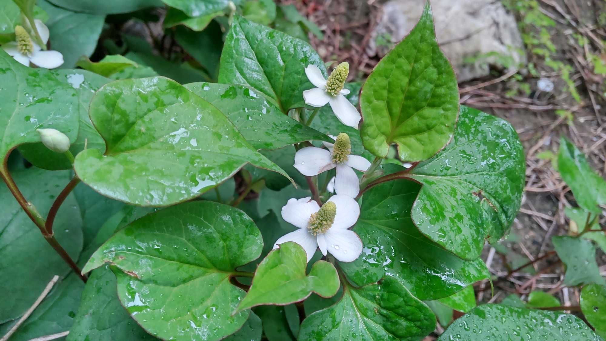 お帰りなさい!!今日は予報は雨でしたがお昼過ぎまで雨は降らず降ってもしっとりお湿り!!ヒンヤリしています昨日の夕日紅柿荘から美しかったですガーベラが新しいお花2本がこれからまた楽しめます真っ赤は元気いただけますドクダミの花と八重のドクダミの花を並べてみましたドクダミの花は何処にでもある花で絵になる花ですね