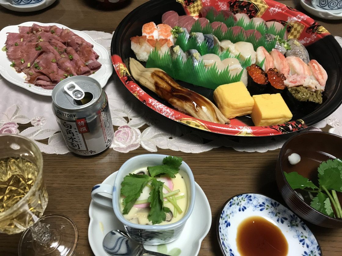 夕方どこかへ出かけたと思ったら、回る寿司のまつりやのテイクアウトを取りに行ったようだ