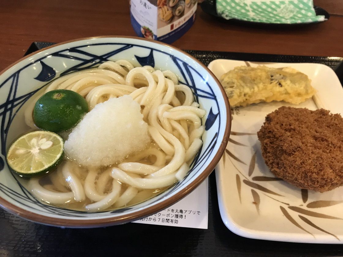 丸亀製麺で、すだちおろし冷やかけうどんにしてみる メンチカツとナス天で750円