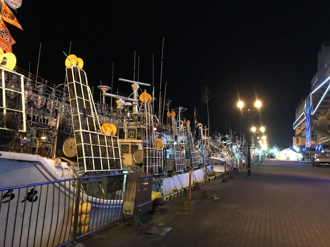 岸壁には、たくさんのイカ釣り漁船が停泊していた
