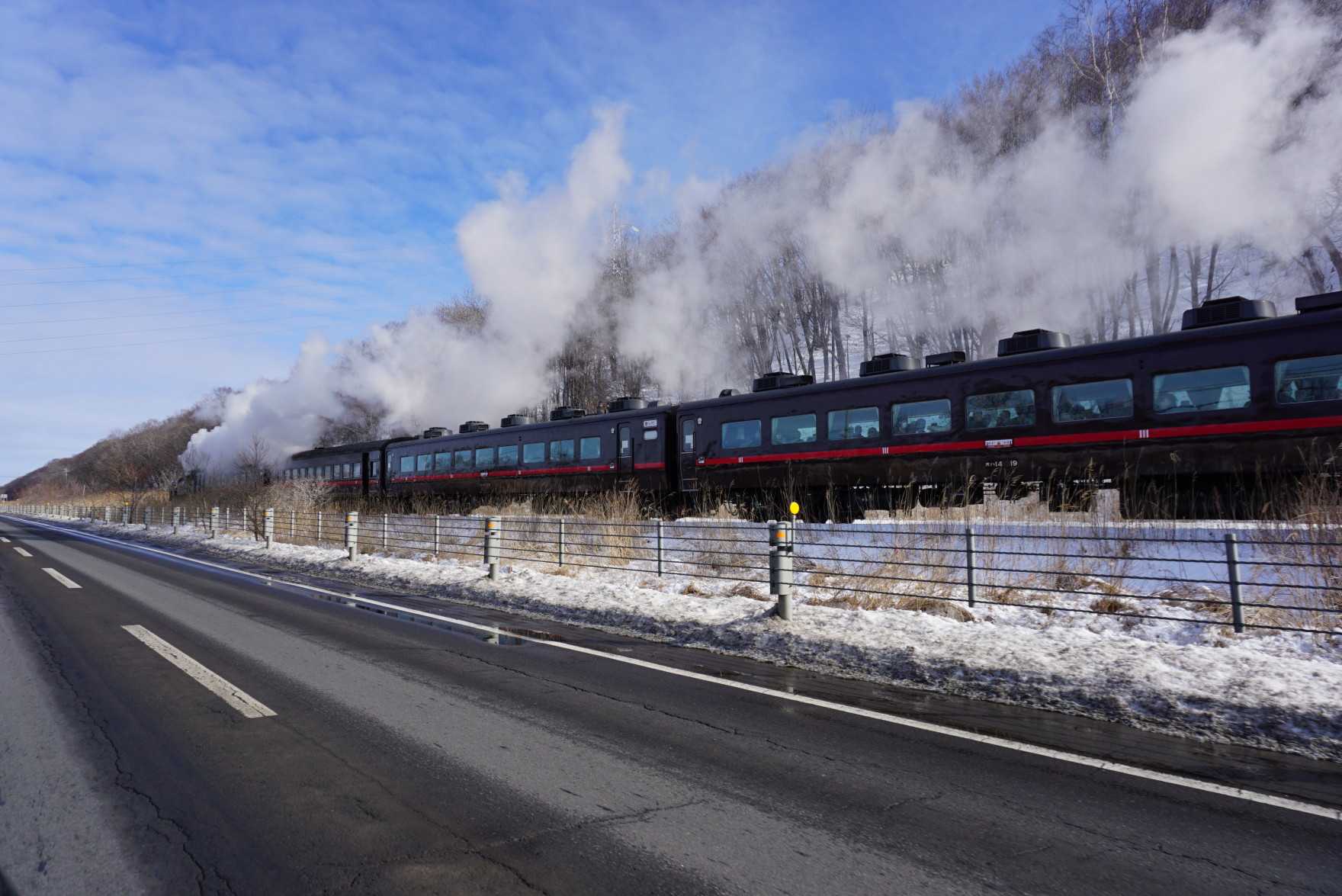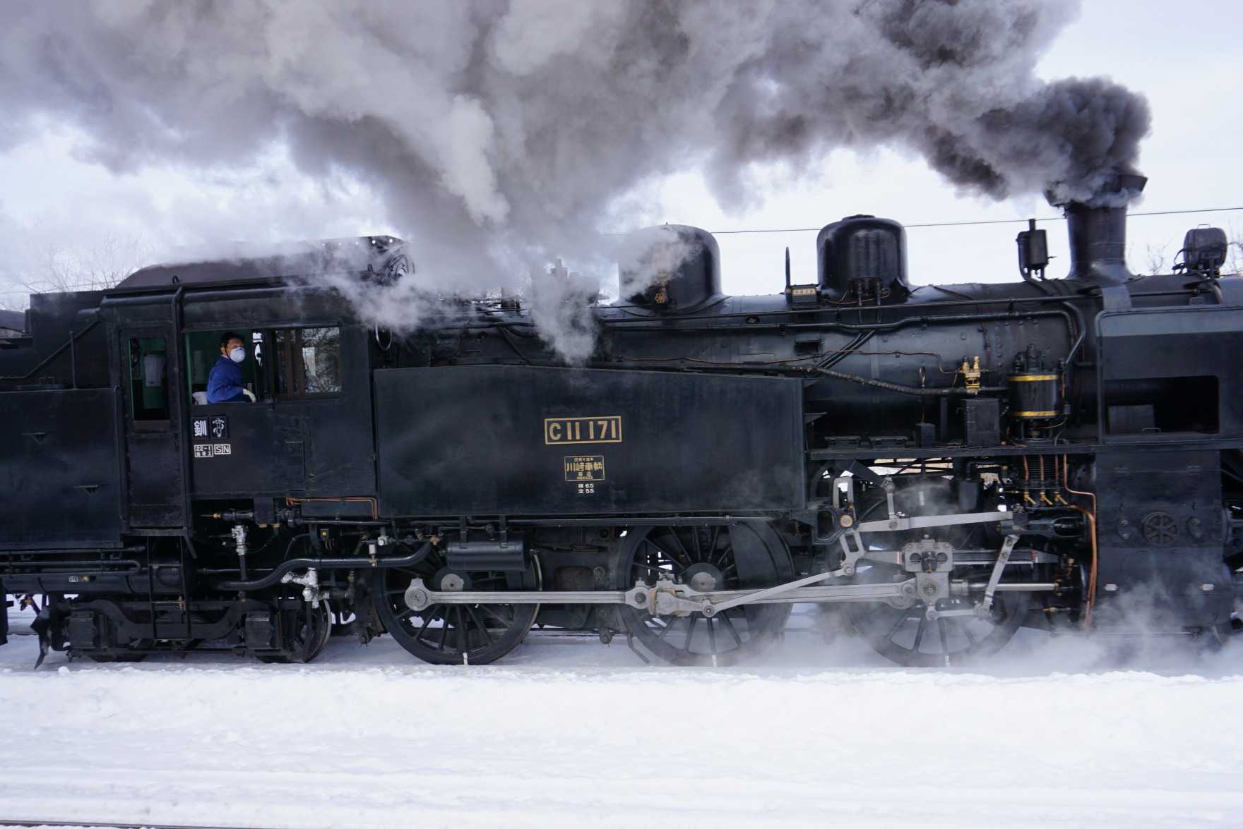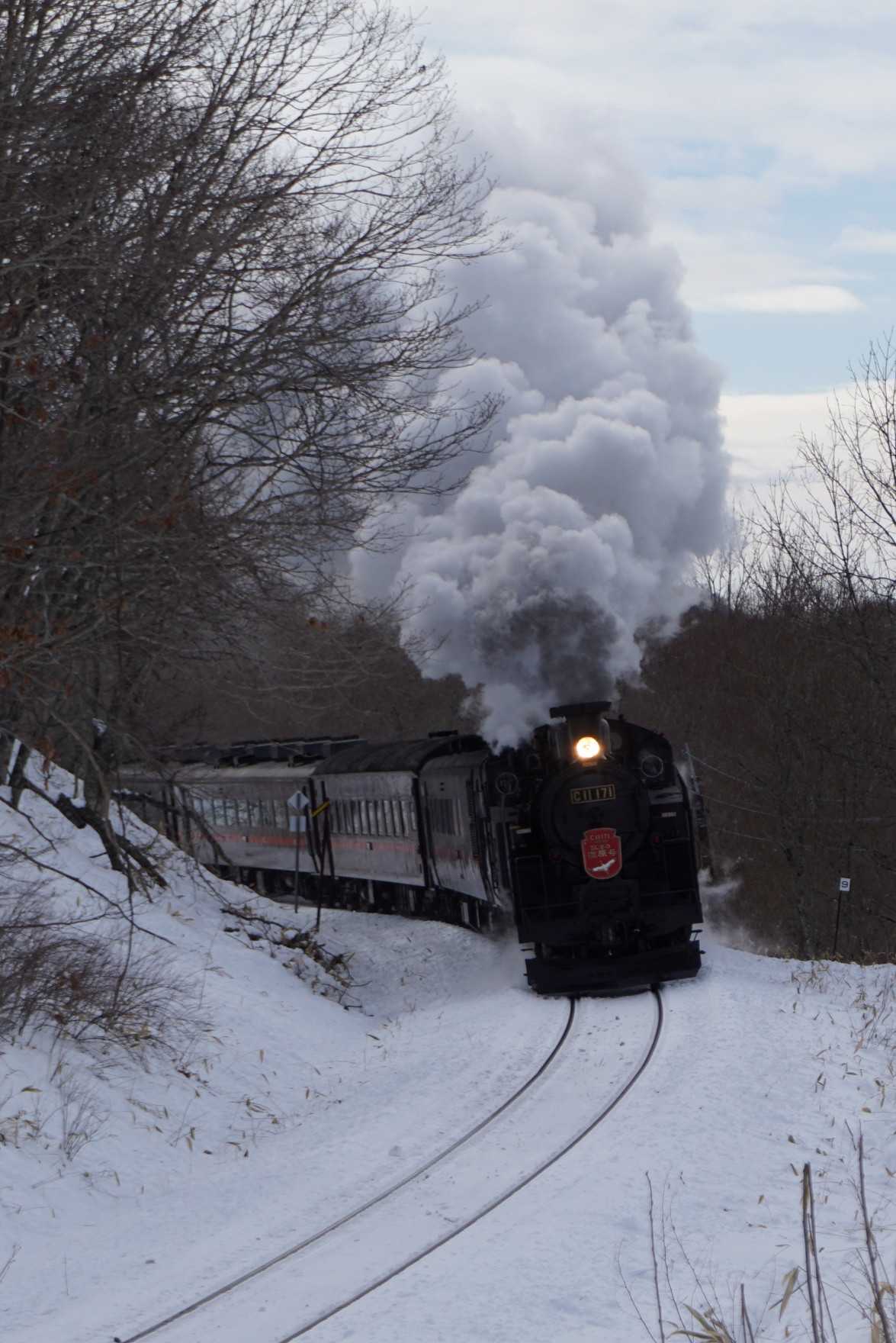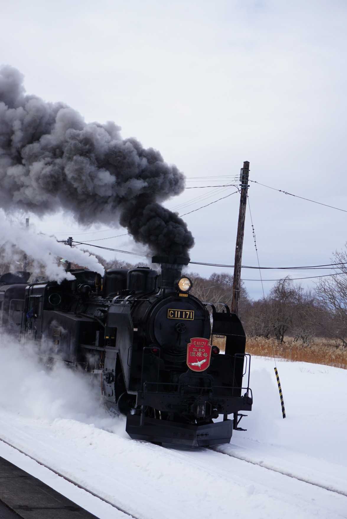 湿原駅を出発してすぐの登り勾配なので、あえぎながらSLはやってくる