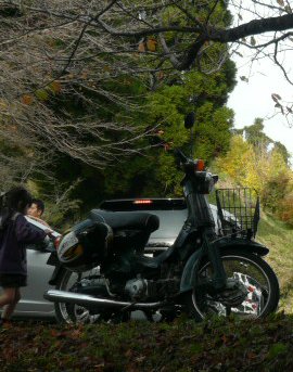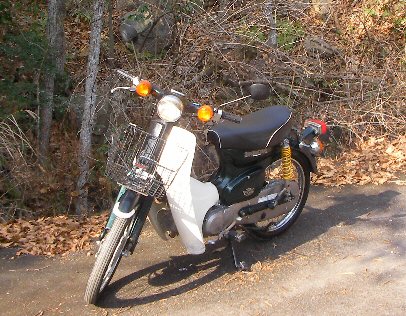 こんばんわくたくたです。今日はカブ納車の日です。ってことで取に行って来ました。簡単なインプレ意外と走ります。いやぁ、もっと遅いかと思ってたんですが坂も割りと登ってくれるので満足です。ただ、1速から2速に変えるときちょっとコツがいりそうですね。今度スプロケ変えてみようかな。。。そのまま、試走で山までいってきました。平地だと、普通に70km/hでました。がんばれば80過ぎいけそうでしたがそんなバイクでもないですからね。でも。。。。。公道を堂々と真ん中走れるって気持ち(・∀・)イイ!!何だろうこの感じ。。。。。童貞を捨てた感覚に似ています。私の場合、年末に一度レンタルで公道走っているので例えるなら、風俗で童貞を捨てた後庶民的な子でさらにやっちゃったって感じでしょうか。。。なんだか、意味不明なことになったので話をもどします。。とそのまま、山に走りにいきました。あ、写真載せてなかったデスネ。これ↓ですv( ̄Д ̄)v イエーイパーツはお店の人に50から移動してもらいました。レッグシールドは冷却効果も考慮してやっぱりつけました。結局純正が一番ですね(ΦωΦ)フフフ…黄色ナンバーキタ━━━━━y=-(゚∀゚)・∵.━━━━━ン!!そのまま、林道に突入してきましたよ。ついでに動画もつくったので良ければ見てください。 酔い酔い動画納車日にリアル森に落ちそうになったのは内緒です。ってことで、くたくたでした。でわでわ