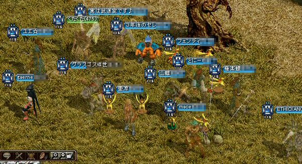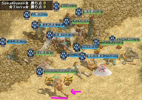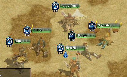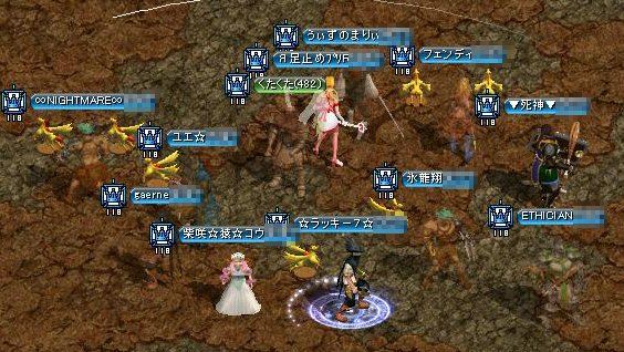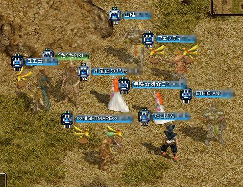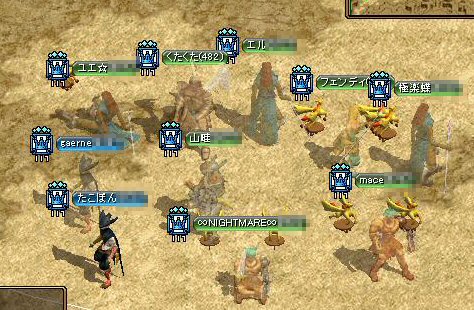 こんばんわくたくたです。今日はGVの日です。相手は☆Tierra☆さんでした。本日の参加者久々参加のナイトメアさんはアキレス腱伸ばして張り切ってます。今日は火力陣大目ですね。いけるかもで、最初の衝突ファイトーー!( ゚д゚)乂(゚д゚ )イッパーーツ!!☆Tierra☆さんも2PTくらいです。Wizさん1人だけのようでしたので、このWizさんをどぉ狙えるかが今日の課題のようです。ただ、ここでミスりました。接近戦ではWizさんのアスヒだよりになるのですが相手側の右をとることでPT安定するのですが、私はWizさん探すのに気をとられて相手の左側に陣をとってしまいました。山さんPTはしっかりと右側とってます。☆Tierra☆さんの今日の戦い方はリトルさんが足止めして剣士さんがとどめさす感じでの戦いです。足止めきつかったです(つд⊂)エーン剣士さんも痛い痛いすぐに逝けましたorz.......でも実は、今日は意外と接戦でしたね今日のPOINTであるWizさんですがテレポ多様する方でしたので、なかなかつかまりません。吸っても物資結構持っているようで、なかなか手ごたえがありませんでした。Wizさんに夢中になっていると、またまたすぐに逝けます。maceさんがんばってました。なんか、おかしいな~っと思っていたら万病在庫切れのようです。とにーさんに頂きました。(TдT)アリガトウが、すぐにαβοοη..._φ(゚∀゚ )アヒャ合計で7回ほど逝きました。穴ですみません。。。。。。で、死亡したまま---------- 終了 -----------対戦頂いた☆Tierra☆さん ありがとうございました。そんな訳で、相変わらずへたれっぷりを発揮した、くたくたでした。でわでわ