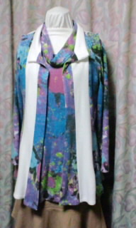 続いても、アンサンブルです。(^_^;) ハイネックより襟を高めにして、カーディガンとの組み合わせです。 カーディガンと組み合わせると更に改まった雰囲気が出ますね!! こちらも、残った物でロングベストを作ってます。 このベストは、リバーシブルになっています。 裏地には、ニットのキルティングを使いましたので、数分もすると背中と腰がポカポカしてきます。(^w^) ベストなので、コレからの寒い時期にコートの下に着ても、腕の動きを邪魔しないでしょうね。 そして、ネックウォーマーで完全防寒出来ますね!!