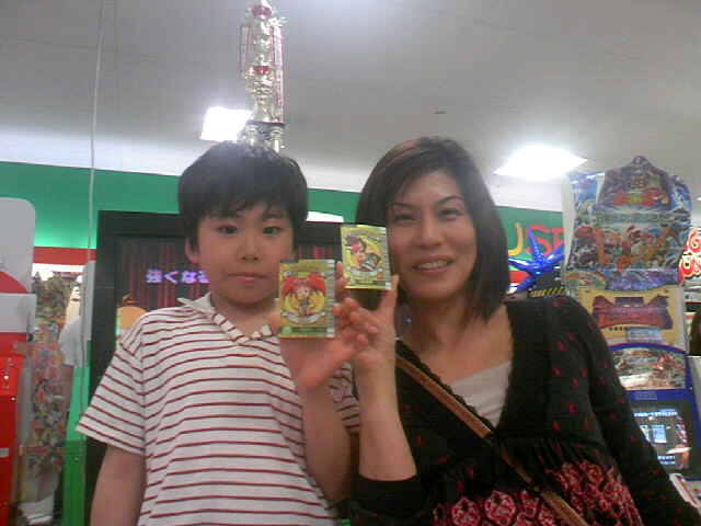 もう2日も経ってしましましたがアップしようと思います もう楽しみにしてる人はいないかも知れませんがあくまでも自己満足?です 日曜はプチ遠征!大会場に着くと・・・ かなり・・・ 少ない・・・ 訳があってもう早家族限定優勝者は! リュウヤ君 姐さんペアです!(でっかくしときましたよ!)ここずっと準優勝ばかりで落ち込んでいましたが3連?準優勝から抜け出しました。この日リュウヤくん絶好調で姐さんも優勝が決まった時は目がキラキラと潤んでいた?もう1つの大会はフリーペアでkuwamushiはユウジパパさん(例のHNでいいでしょうか?)とのペア長い間共に大会に出場してましたがペアになるのは初めてでした1回戦! なんと相手はユウジパパさんの奥様ナオミママさんと息子のリュウトペア! ・・・人数が少なかったので当たる確立70パーセント?ユウジパパさんと相談して最初はリュウトが出ると読みユウジパパさんが先に出ることにしたんですがなんとナオミママさんが先にそれでもユウジパパさん対戦しナオミママさんが倒れリュウト登場!ユウジパパさんリュウトのぬいぐるを外すが倒されkuwamushi登場!リュウト体力半分!調子に乗ったkuwamushi必殺をくらい・・・体力半分・・・次も負け・・・kuwamushi危うし!!!と思ったらじゃんけんに勝つがリュウト僅かに体力残りもう1手と思った瞬間ボルケーノは発動し勝利!かっこよく演出?出来ました・・・・・もうドキドキ2回戦!2人調子が良くうまいバトンタッチで勝利!準決勝!相手は強豪のりゅうやパパさんとトシ子ママさん!カードを選びながらトーナメント表を見てみると!!!! なんと 決勝戦でした!それを知った瞬間かちこちのkuwamushi!ユウジパパさんとトシ子ママさんの対決から始まりましたがなんとほぼストレートでユウジパパさんトシ子ママさんを倒しりゅうやパパさん登場!ほぼ互角に戦い中盤からユウジパパさんが1手負けてりゅうやパパさん有利にたちkuwamushiいつでも交代出来る様にスタンバイしてましたがここで試合が動きユウジパパさん逆転勝利!って言う事で ユウジパパさん kuwamushiペア晴れて優勝ですほとんどユウジパパさんの頑張りでkuwamushiは何も・・・コバンザメの用にユウジパパさんからおこぼれを頂いていいのでしょうか?駄目と言ってももう名前を記入してしまいましたのでこのペア戦で我が家のYUママさんとユウジパパさんの息子さんのハルトとペアを組み残念カードを貰ったみたいですけど!ナオミママさん~逆にユウジパパさんに最高のカードを確かに頂きましたので有難う御座いました最後の大会は1回戦は勝ちましたが2回戦で浮気をしてシクレを使ってみましたが悪い事すると駄目ですね!あっさり負け・・・・・・・・・・・・・この大会で優勝したのは仲良く記念写真 リョウガが優勝でしたトシ子ママさんも大喜びですほんとこの日は人数が少なくちょっぴりこの先心配になって・・・なにか考えて店舗側と相談して人数が集まる様にしないといけませんね・・・みんなで話し合って楽しい大会を考えなくては!の方が楽しめますよね