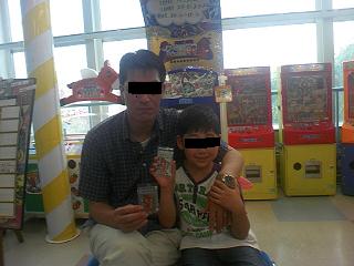最近仕事でビッチリPCを使っていて更新までこぎつけなかったkuwamushiです!それまで恐竜大会はあって参加したりしなかったり・・・ 7/25は午前にドラクエ大会だあったんですがkuwamushiは仕事、YUママも仕事・・・KYONは夏休み?連れて行く事ができないのでお仲間ママさんにお願いして参加 自分で考え戦ったものの2回戦で敗退・・・でも自分で考えアドバイスなしで一回戦勝ち抜きは・・・いいの? 午後から恐竜大会!kuwamushi観賞予定でしたが仕事で時間が延び行く事が出来ず結果も・・・ YUママさんはよかった物のKYONが撃沈だったみないな 7/26 恐竜大会4大会!今までムシキングのときから大会でお世話になっていた会場が今回の大会で終了 っていうのも恐竜のカードがなくなり次第撤去ムシの大会の時はかなりの人数でしかも抽選だったので大変だったのを覚えていますでも今は・・・しょうがないですね・・・ 最後に!ってことで大奮発!しかも2台での大会!その前に信じられない.1 プチ遠征に行く途中!窓をあけてを走行中いきなりペチャと言う音と同時に顔半分に液体が!!!!!! 恐らくムシが・・・ その液体が・・・ 超~くさい!!!!!!!その液体ツイたまま会場まで・・・安全運転で・・・そのままトイレに駆け込みタオルでフキ^2・・・幸い服には付いていなかった話戻って1大会目小学生以下1頭VS1頭KYONのみ参加! 1回戦目シードで2回戦、準決勝何とか勝ち進み決勝戦! 信じられない.2 ここの会場と相性が良かったのか前回の恐竜王に続き・・・ 優勝する事ができました が ここで信じられない.3店舗さんカードの名前を石頭さんの御子さんの名前を!!!!!!!!(石頭さんは喜び?)後ほど送ってくれるそうです 2大会目!シニア1頭VS1頭!YUママ、最後の大会という事でkuwamushi参加! kuwamushiは石頭さんと対戦であっさり敗退・・・ちなみに石頭さん次の戦いで・・・ハイタイ・・・何手・・・ダッタカ・・・ ちなみにkuwamushiVS激烈石頭戦はあいこが1回あったので3手でした・・・YUママはというと恐竜との相性がバッチリで次々と! 決勝戦は落ち着いて戦って! 信じられない.4 まさか2大会連続!&恐竜王同様 親子同時優勝!!!する事ができましたkuwamushiも大満足!!!!!!もうお昼も食べたのでお腹もいっぱいです! 3大会目!無制限(年齢共)1頭VS1頭! ここで帯広からの遠征!北国でも有名家族のU・Sファミリー(了解とって無かったので此方で・・・) 人数も増えもう満足しているkuwamushiファミリー!KYON YUママ1回戦敗退・・・kuwamushiはというと何かにとり憑かれ嘘の様にジャンケンが噛み合い決勝まで・・・そー言えばムシの液体も付いたし・・・決勝は遠征家族U・Sパパさん!最初はいい戦いでkuwamushiおされ気味だったが何とかSパパさんの1頭目を倒し2頭目登場! リードをしていた物の1頭目を倒され2頭目おされ気味! 万事休すと思いきやkuwamushiデス発動でお互い全爪状態!!!!! でも世の中そんなに甘くはありませんよね・・・kuwamushi ボタンを押して 信じられない.5・・・ kuwamushiのデスが決まり優勝!してしまいました・・・3大会家族連続優勝を初めてしてしまいました!もう大^100満足です!奇跡です! そして本当の最後の4大会目無制限(年齢共)2頭VS2頭!回復系禁止! KYON YUママ敗退・・・がどうしたのかkuwamushi勝利? 会場に来る前のムシに憑かれたのかそれともツイたのか??? 石頭さんの御子さんタカとの戦いでここまでか!と思う所がありましたがお互い全爪状態からのkuwamushi勝利!この時から周りの・・・kuwamhishi完全なるアウェー空気読めないkuwamushi? そして決勝戦!相手は牙舞さん !対戦勝率軍配は牙舞さん ! 後ろの視線がチク^2と! ただ一人だけ違うのがYUママ!kuwamushiの勝利の女神 恐竜を代え牙舞さん に挑み順調にジャンケンに勝ち・・・ 本当にこれで良かったんでしょうか? 信じられない.6 とその前にkuwamushiとKYONの写真に入りたいと言っていたがママさんの連れて行かれ泣いていたairaとの2ショット!鼻の下が伸びる?・・・また石頭さんに怒られる?KYOU? 肩に手を廻していないので大丈夫でしょうか? 話を戻って信じられない.6の続きで 本日2回目の優勝!どうした!kuwamushi! 皆さんどうも今日はスイマセンでした・・・最後の4大会・・・kuwamushi家 4連続優勝してしまいました!1日で全集類コンプ(KYONのは後に・・・) 信じられない事ばかり・・・もうしばらくは優勝は無いでしょう! またしばらくはYUママ KYONのアドバイザーに廻ります! 最高の1日でした!