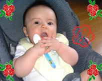 五ヶ月と一日目の今日の僕、寝起きからこんなにご機嫌だったので初めての離乳食(米がゆ)に挑戦したんだぁーー♪スプーン一杯だけね^^感想は「ん?なんだこれ??(>▽<)」でもスプーンをなめるのは楽しくってずっとペロペロしてたよぉ~(>U<)夕方からお買い物に出かけて帰ってきてから初めての☆桃☆を食べたよ^^(果汁をね~っ!)おいしかったぁーー(・ω・)/でもその後おなかがゆるくなっちゃいました(@д@)がーーん。僕って意外に繊細!?