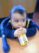今日はパパとママとお出かけしてきたよ~♪目的地へ着くまでに、サンタ発見!!!このサンタはいつも同じ場所に年中座っている(笑)お買い物の前に知り合いのカレーやさんにお昼ご飯を食べに行ったよ(*^^*)頂いたオレンジジュースがかなり美味しくって取り上げられても、自分でつかんで取り戻して・・・・飲んだ!!!爆そういえば最近アクアライトか麦茶しか飲んでなかったな~^^;やっぱりジュースは美味し~~♪パパとママがカレーを食べている間、僕は観察するのみかと思いきや、おこちゃま用カレーを特別に頂いてしまった~~~(*^^*)ので、ちょっと挑戦!カレーデビュー☆最初は「ん?好きかも・・・^^」っと調子にのって、三口食べ、「か・からい・・・(>。