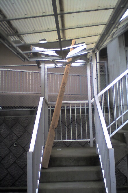 大変ご無沙汰しておりました・・(-.-;)一昨日の夕方久々にブログを更新してたら、台風のおかげであともうちょっと!ってとこで停電になり、なーーんと翌朝10時まで復旧せず電気のない超スローライフを送りました夜8時になったら、真っ暗でもう寝るしかないって感じお友達の所なんて、一日半も停電してて、お風呂にも入れなくって、銭湯に行ったら、大行列だったらしい。最近は台風っていたても、「非常に強い大型な」とか言いながらも大した事がなかったので、あまーく見てたら今回のは予想以上にひどく、こんなものまで宙を舞っていたようです!!どこかからか飛んできて、屋根を貫通した木材もしここを誰か人が通ってら・・・と思うと、恐ろしい!!ベランダに畳んで保管してた僕のプールも、漫画かマジックか!?の様に、ヒラヒラ~~って宙に浮かびどこかに飛んでっちゃいました~近所の駐車場のフェンスもなぎ倒されてたし、天災ってやっぱり恐ろしい~~~~~さてさて・・・ここ三ヶ月も(ぉぃぉぃ!)更新してなかったので、「もぅブログ辞めたの?」と聞かれることも、しばしば だった今日この頃☆みなさんはどんな夏を過ごされましたか~?僕は7月にパパのお国へ行って、パパのお友達の♪結婚式♪に参加してきたょ~っ((o(^-^)o))はるばる日本から参加したにも関わらず、教会での神聖なる式の真っ最中に、「プッ!!!」っと、立派なオナラを披露してしまい、恥をかいちゃいました(-.-;)7月末に帰国してから、風邪をひいてしまい、それがママにうつり、ナゼカ1ヶ月も治らず、☆引き込もり☆な夏を過ごしちゃったんだー(>_