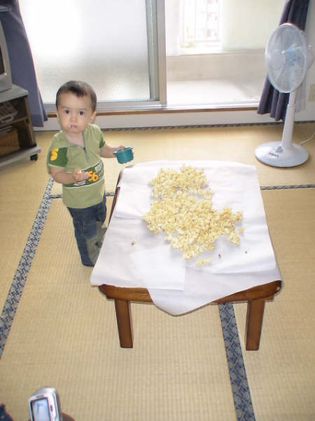 この前の日記に書いたご近所のアメリカのママさん宅に最近よく遊びに行ったり、来てもらったり、ベランダ越しに「お~~~~い」と手を振ったりしています。半年間も近くに住んでることを知らなかったのが嘘のよう。先日、「キャラメルポップコーン作り」にご招待され、行ってきました♪っていうか、キャラメルポップコーンって自分で作れるんだ?ちょうど、彼女のお友達がアメリカから来ていて、みんなで一緒に作ったよ~!お友達がはるばる日本まで20時間もかけて、遊びに来てくれてるって、すっごい素敵だなぁ~って思ったよ。「遊びに行くね!」って口約束しても、やっぱり遠いし、時間や金銭面でのタイミングが合わないとなかなか実現させるのって難しいと思う。でもお友達はそれをやってのけた私も結構大胆に「ポーン!」って旅行に行ったりする方なので、そんな行動的な人、大好きそういう人でありたいなぁ・・・。でもその為にはやっぱり働きに出ようかしら・・・と悩む今日この頃。話がずれちゃったけど、みんなで協力して作って、(あ、でも私は殆ど見てただけ^^;)テーブルの上で乾かして、冷まして・・・・・。あれ???フライングですから!!↑全く手伝ってもいないのに、一人で勝手に食べ始めてしまった人。最近この二人、超ラブラブです。チューとかしまくってます(笑) 手作りの「キャラメルポップコーン」は大成功か~な~り美味しくできました(しつこいようだけど、私は見てただけ!汗)お土産で大量に頂いて、こんなに食べれるかな?っと思っていたのに、翌日にはきれ~~~~いに全部食べちゃいました(笑)ここ最近、ご近所仲間がたくさん出来てきていい感じ♪だけど・・・たぶん二年後の今頃にはみ~んなどこかに引越しちゃってるんだよね今からそんなこと考えても仕方ないけど、悲しすぎる