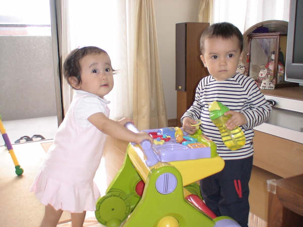 昨日報告し忘れてたけど、パパのお国へ行ってすぐ、普通の「ハイハイ」が出来るようになったよ~~~~! 今まではかなりのズリバイだったのに・・・。これで更にスピードアップ!!!そして、むこうには歩行器が無く、かなり足を鍛えてきたので日本に帰ってくると例の「ジョージ」のバスを自分で押しながら歩けるようになってたよぉ~~~☆ミかなり成長しちゃったかも(^^ヾ今日は「納豆デビュー」の日♪んんん??? でも結構好きかも(*~~)