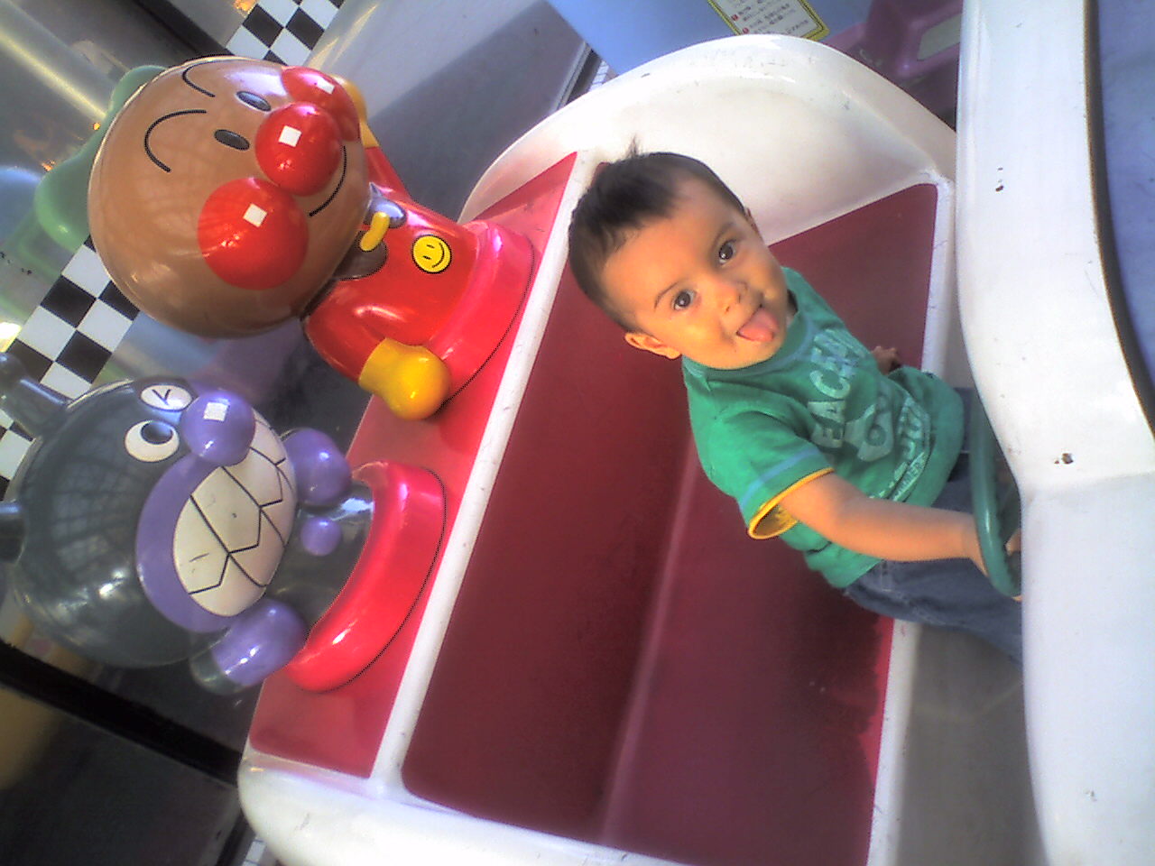 今更ですが・・・明けましておめでとぅございます~行方不明状態から、復活ですブログの壁紙も変え(楽天のをお借りしてるだけですが^^;)気分一新、日記の更新もボチボチ頑張っていこうと思います♪というわけで、今年も宜しくお願いしますペコリ。ところで、最近のカイル君。年末位から、言葉が急に増えてきて「し~でた。」(おしっこ出た→と、もちろん言うだけ)とか「あ・き・ち~?」(開けて!)とか「ないよ~」とか「あっち~!あっちぃよ~!!」(熱いよ)と言うようになったよあれ?全部日本語じゃん!!笑同時にアンパンマンがかなり好きになり、「アンパンマン!」「ばいきんまん!」「ドッキンちゃ~ん!」と言うように^^そんな時、グッドタイミングで、大好きなアンパンマンがご近所にやってきたのです~!!ワ~イ♪最初は「え?アンパンマン?(@_@)??」っと実際にアンパンマンが動いてるのを見て、理解しがたかったみたいだけど、「アンパンマン!アンパンマン!!」とかなり興奮しておりましたショーが終わって、記念撮影へ。気がつくとすごい行列で、もう写真は諦めるか・・・と思ったけれど、アンパンマンが来ることなんて、そんなに滅多にないし・・・。っと引き返し、行列の最後尾へアンパンマンに抱っこされたカイルの反応も見てみたかったし・・・ 「シャッターはお一人様一回のみでお願い致します~。」と会場のお姉さんのアナウンス。そして長い時間待って撮れた写真が コチラ↓カイルったら、かなりビビッテいる!!笑しつこく「シャッターは一回のみで」と言っていたお姉さんもさすがにこれには同情か?もう一度チャンスをくれましたその後撮れたのがこれ↓ププっ、一枚目とあんまり変わらない!?まだ顔が写ってるだけいいでしょ?後で気づいたけど、一枚目と比較するとカレーパンマンがすっごく心配してくれてる!!笑優しいのね~こんなに号泣だったのに、写真を撮って、ステージから降りると振り返り、満点の笑顔で「バイバ~~~~イ」とアンパンマンに手を振っていたカイル・・・。すごい変わりっぷりにビックリだよ~~~~まだ色々書きたいことはあるんだけど、カイル君がお目覚めのようなので、また今度書きますね。それではまた~~~