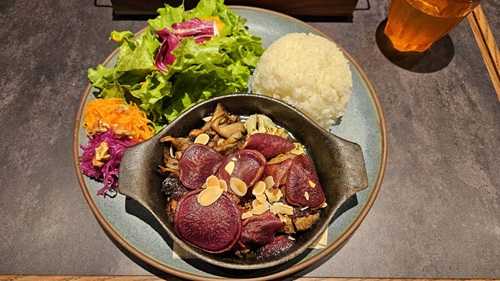 紫芋のチップスの下にポークやカリフラワーが隠れています