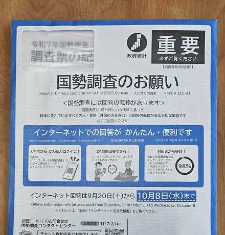 国勢調査の用紙を町内の役員さんが15日に届けてくれました