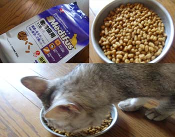 ●●●2008/7.2こんばんは うちのにゃんこが、いいもの頂いたので、紹介です♪11歳からの老齢猫用のキャットフード メディファスです。パッケージを見てみると おおっ、ヨード卵が使われています!! なんだか贅沢~!と思ったら この商品を作ってる会社ペットラインは、ヨード卵光を作ってるNOSANのグループ会社だったのですね!とっても体に良さそうな感じ!!ということで、早速にゃんこに あげてみました!!↓にゃんこ気に入ったようで、ガッツイテいました。匂いも美味しそう!必要なすべての栄養素をバランスよく配合してあって体に良さそうなので、気に入ってもらえてよかったです。にゃんこは、家族の一員だからいつまでも健康で元気でいてもらいたいしメディファスなら国産で、低脂肪・低カロリーで、安心だし今度は、自分で購入しよう!!pet line HP成猫期用 メディファスHP