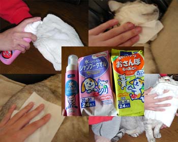 ●●●2007/12.30皆さん こんばんはぁ^^モラタメ×LIONのペット用品モニター5回目の商品は、■「水のいらない リンスインシャンプー(愛猫用)」■「水のいらない シャンプータオル(やわらかMサイズ)」■「ボディケアシート おさんぽそのあとに(Mサイズ)」です。では、使ってみた感想を書きます☆今回丁度、にゃんこが、猫臭が出てきてお風呂入れようと思っていたけど寒くなってきたから風邪ひいたら嫌だし、どうしようかな?って思っていたら今回の3商品を頂けたので、ラッキーでした♪にゃんこのシャンプータオルは、他のメーカーの物を使った事があったけど、香りが変で、好きじゃなかったですけど、今回頂いたシャンプータオル香りが凄く良かったです 大きさも全身拭くのに1枚で丁度良かったです。厚みもまあまああって拭きやすかったですよ!!汚れは、落ちたかは、家猫なので分からないけど毛艶がよくなった気がします。水のいらない リンスインシャンプーもタオル同様香りもよくて、泡タイプなので使いやすかったです。タオル同様、花粉アルゲンキャッチャー配合らしいので、花粉症の私には、ポイント高いですね◎!ボディケアシート おさんぽそのあとには、目や耳にも使えるという事で、耳掃除、目やに拭きあごの下や肉球や指の間などデリケートなところを拭いてみました。大きさは、丁度使いやすいサイズで、厚さは、普通かな?汚れ落ちも良かったです。除菌成分配合なのにノンアルコール、なめても安心成分配合って使う私もにゃんこも安心して使えて嬉しくなっちゃいますね。今回も良い商品のモニターが出来て良かったです。モラタメさん&LIONさんありがとうございました。人気blogランキングに参加していますぅ。ガックンと下降気味ですぅ(T▽T) これからも頑張りますのでぽちっと応援宜しくお願いしますぅぺこりっ☆↓