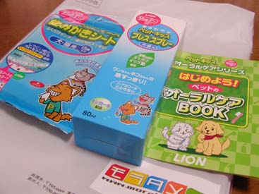 ●●●2007/10.11皆さん おはようございます。モラタメ×LIONのペット用品モニター3回目の商品が、届きました。ペットキッス 歯みがきシート&ブレススプレーです。使ってみた感想を書きます~~~~~~~~(=^エ^=)!!にゃんこのオーラルケアは、今までやったことがなく今回初体験なので、ちょっとドキドキwww説明通りにまずは、ブレススプレー(天然由来成分キトサンオリゴ糖とキシリトールを配合)を手にスプレーして、はいどうぞって舐めさせようと思ったらうちのにゃんこクンクンして( ̄‥ ̄;) 直ぐに興味なし・・・・・・去って行きました。次は、にゃんこのお口開いて、ブレススプレーを直接シュッとやってみたら・・・・・・・・どうもにゃんこ的には、嫌だったみたいで止めろー×10とバタバタ暴れて、ネコパンチ&ネコキックをして・・・ウゲウゲしながら猛ダッシュで、他の部屋へ逃げてしまいましたwwwどうやら慣れるまで時間が掛かりそうです。でも、落ち着いてからにゃんこのお口の匂い嗅いだらお魚臭くなくなってたよ~♪もう1つの歯みがきシート(歯ブラシなしで簡単にお口の手入れができるウェットティッシュタイプ。)も試してみました。こちらは、指に巻き巻きして、にゃんこのお口開けさせて、チャレンジしてみました。始めは、ウゲとかなったけど、スプレーほど嫌がりませんでした。良かった~~~wwwシートが黒くなって汚れがとれている感じにはならなかったけど黄ばんだ感じになってて、歯も綺麗になったよ!!刺激のないノンアルコールだから安心だし、液成分が歯の汚れを浮かせ、特殊形状のマイクロファイバーシートが、汚れを残さずしっかり拭き取ってくれます。オーラルケアになれてきたら、歯磨きシートでふき取ったあとにブレススプレーをすると効果的らしいので、慣れるまで大変だけど、続けてみようと思います。人気blogランキングに参加していますぅ。ガックンと下降気味ですぅ(T▽T) これからも頑張りますのでぽちっと応援宜しくお願いしますぅぺこりっ☆↓