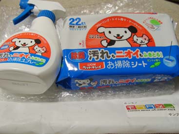 ●●●2007/11.3010月のモニター商品は、【お掃除シート + お掃除スプレー】でした。 凄くさわやかなミントの香りで、kaoriは、にゃんこのTOILETの周りに使ってみたけど汚れが簡単スムーズに取れて使いやすかったです。シートタイプの方は、ワイパーに付けて床をごしごし出来るし、そのままTOILETを拭いたりも出来てめちゃ便利でした。しかもペットが、舐めても安心な成分で出来ているので、安心して使えちゃいます。後片付けもゴミ箱にぽいっと捨てるだけで楽ちんでした。スプレータイプも2プッシュくらいシュッ×2と汚れの酷いとこにかけてふき取ると綺麗に汚れが落とせちゃいました。除菌も一緒に出来ちゃうのも嬉しいところですねぇ!!