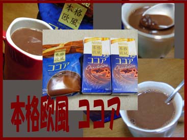 ●●●2007/11.30モラタメさんで、試してみたのは、ネスレ本格欧風ココア ショコラティエール2箱とネスレ本格欧風ココア(370g)をセットしたものです。ショコラティエールは、チョコチップ入りの贅沢なココアなんですよ!聞いただけで飲んでみたくなるでしょ!?凄く香りもよくって甘すぎず、ほろ苦さのなかに適度な甘みもあり、疲れた体を癒してくれるって感じで、凄く美味しかったよん(人´∀`).☆.。.:*・゚そして、ネスレ本格欧風ココアもミルクココアと違ってほろ苦くて大人のココアって感じで、美味しいのオランダ製のココアパウダーをふんだんに使ってるんだって!なるほどって感じです!!寒くなってきた今の時期なんか最高です!!でも、夏にもアイスで、飲んでも甘ったるくないからいいかも!!ココア好きは、是非お試しあれ!!