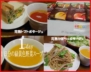 ●●●2007/8.15モラタメさんで、この前当選した、クノール 1日分の緑黄色野菜スープ10種の野菜の完熟かぼちゃポタージュと10種の野菜の完熟トマトポタージュが各2袋セットです。 どちらともお昼に飲んでみました1日分の緑黄色野菜スープ10種の野菜の完熟トマトポタージュは、ツナ&チーズのホットサンドと一緒に飲みました。お味は???飲む前は、きっとトマトジュース系っぽくトマトが強いのだろう!?と思っていたんですが、ブーはずれ!!トマトの程よい酸味とパセリ、バジルなどの野菜一つ一つの味が、感じられて、チーズが、結構きいていて飲みやすく濃厚だけど、しつこくない感じで、贅沢なお味でした。続いては、1日分の緑黄色野菜スープ10種の野菜の完熟かぼちゃポタージュタラコといかとキャベツのパスタと一緒に飲みました。こちらもやはり、凄く野菜本来の味が、いかされていて凄く濃厚で、自分で、作る、かぼちゃのポタージュとは、全然別物で、本当に贅沢なお味で、美味しかったです。kaori的には、完熟かぼちゃポタージュが、お気に入りです旦那さんは、完熟トマトポタージュが、お気に入りだと言ってました。しかし、1日に必要な緑黄色野菜120g分をカップに1日分の緑黄色野菜スープと熱湯を注いで混ぜるだけで簡単に摂れてしまうなんて、めっちゃ優れものです!!忙しい朝やぱぱっと簡単に済ませたいお昼にぴったり~8月20日(月)新発売だよ~♪クノールHP人気blogランキングに参加していますぅ。ガックンと下降気味ですぅ(T▽T) これからも頑張りますのでぽちっと応援宜しくお願いしますぅぺこりっ☆↓