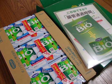 ●●●2007/11.30今月の1日に当選したものは、ダノンBIO プレーン1ケースでした。そうそう、14日間チャレンジってやつです。普段は、加糖タイプを食べてたんだけど、プレーンも意外とそのまま食べれましたよ~☆子供が食べるプチダノンのまったりした感じを少しさらっとした感じで、甘みなし!酸味は、そんなにないかな!?って感じの味です。お通じめっちゃよくなりますよ~☆これ本当!!体質にもよるとは思うけど私には、goodでした☆ただ途中食べ飽きたので、バナナと牛乳を一緒にミキサーにかけて飲んだりしました。