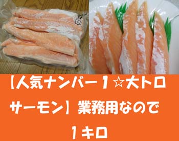 ●●●2008/7.12こんばんは 【人気ナンバー1☆大トロサーモン】間宮塩蔵~魚食のすすめ~さんで、購入しました!!1kgって、やっぱり結構量がありますね!小分けして、実家と弟夫婦、妹におすそ分けしました!お刺身と炙りおろしポン酢、塩焼きにして食べましたが、凄く脂が乗っていて、美味しかったです!!特に炙りおろしポン酢が、私的に臭みも脂っこさも消えて一番美味しい食べ方でした。みんなの評判も凄く良かったですよ!超人気商品なのが、納得って感じです。ただし皆さんの仰るとおり、多少生臭さは、ありましたが、全く生臭さのないサーモンなんて存在しないでしょ!?だからお魚独自の生臭さが苦手な方には、お勧めできません。【当店人気ナンバー1☆大トロサーモン】業務用なので1キロでこの価格!プロ御用達品だから安くて旨い!とろとろの脂がたまらない♪人気のトロサーモンがタップリ入って驚きのこの価格!!あと、【脂ビンチョウマグロ】も一緒に購入しました!1袋にまとめて4ブロック位入っていました。それと解凍用にお塩とクッキングシート、説明書も付けて下さっていました。説明書の通りに解凍して食べてみましたが、生臭さも脂臭さも無く、凄く脂が乗っていて、とろとろで、美味しかったです♪【脂ビンチョウマグロ】太平洋の大海原を泳いで、しっかりと脂がのった極上の天然ビンチョウマグロ