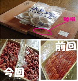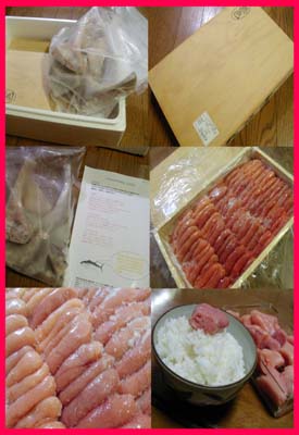 ●●●2007/11.30前にたらこ2kg楽天オークションで、落札したって日記に書きましたよね!→前回のたらこ今月また購入したんだけど、まじムカつく!!掲載写真とも前回のものとも全然べつものだったんです!!レビューをみたら他の方も同じ事があったようです。検証写真あるので、見てみて下さい。↓極小、切れ子ならちゃんとページに書いておくべきだと思う!贈答用にも喜ばれますって書いてあったけど、1箱よそにと思って、2箱買っちゃったのに木箱、割れてましたけど~www(怒)オークションページ