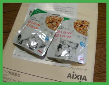 ●●●2007/9.12今回の当選品は、アイシアのフォトコンテストのもれなく賞で、応募者全員にというもので、参加賞みたいなものです。ミックスフレークのさけ&かつお節入りマグロとしらす&かつお節入りマグロでした。入選は、出来なかったけど、にゃんこが、喜んで食べてたからOKかなぁ~。しかしMiaw Miawのパッケージの写真のにゃんこめっちゃ可愛いですよねぇ~♪人気blogランキングに参加していますぅ。ガックンと下降気味ですぅ(T▽T) これからも頑張りますのでぽちっと応援宜しくお願いしますぅぺこりっ☆↓