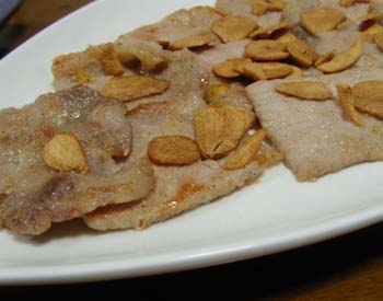 ●●●2007/9/12皆さん こんばんはぁ。今日の料理は、豚のにんにく焼きです。カリカリにんにくが、アクセントになって、シンプルで、簡単だけど、おいしいですよ~。ではでは、詳しくは、下記を見て下さいねぇ。 豚のにんにく焼き 材料と作り方 【材料】・にんにくスライス・豚の生姜焼き用・バター・牛脂・塩コショウ・醤油【作り方】 1.フライパンに牛脂を入れ溶けたらにんにくスライスをカリカリに炒め火を止め、カリカリになったにんにくを器に入れておきます。2.豚肉は、一口大に切ってから塩コショウをふっておきます。3.1のフライパンにバターを加え溶けたら2を加え醤油を少したらしほんのり狐色の焦げ目が付くまで焼き、焼けたらお皿に並べ上に1のカリカリにんにくをまばらに乗せて完成です。人気blogランキングに参加していますぅ。ガックンと下降気味ですぅ(T▽T) これからも頑張りますのでぽちっと応援宜しくお願いしますぅぺこりっ☆↓