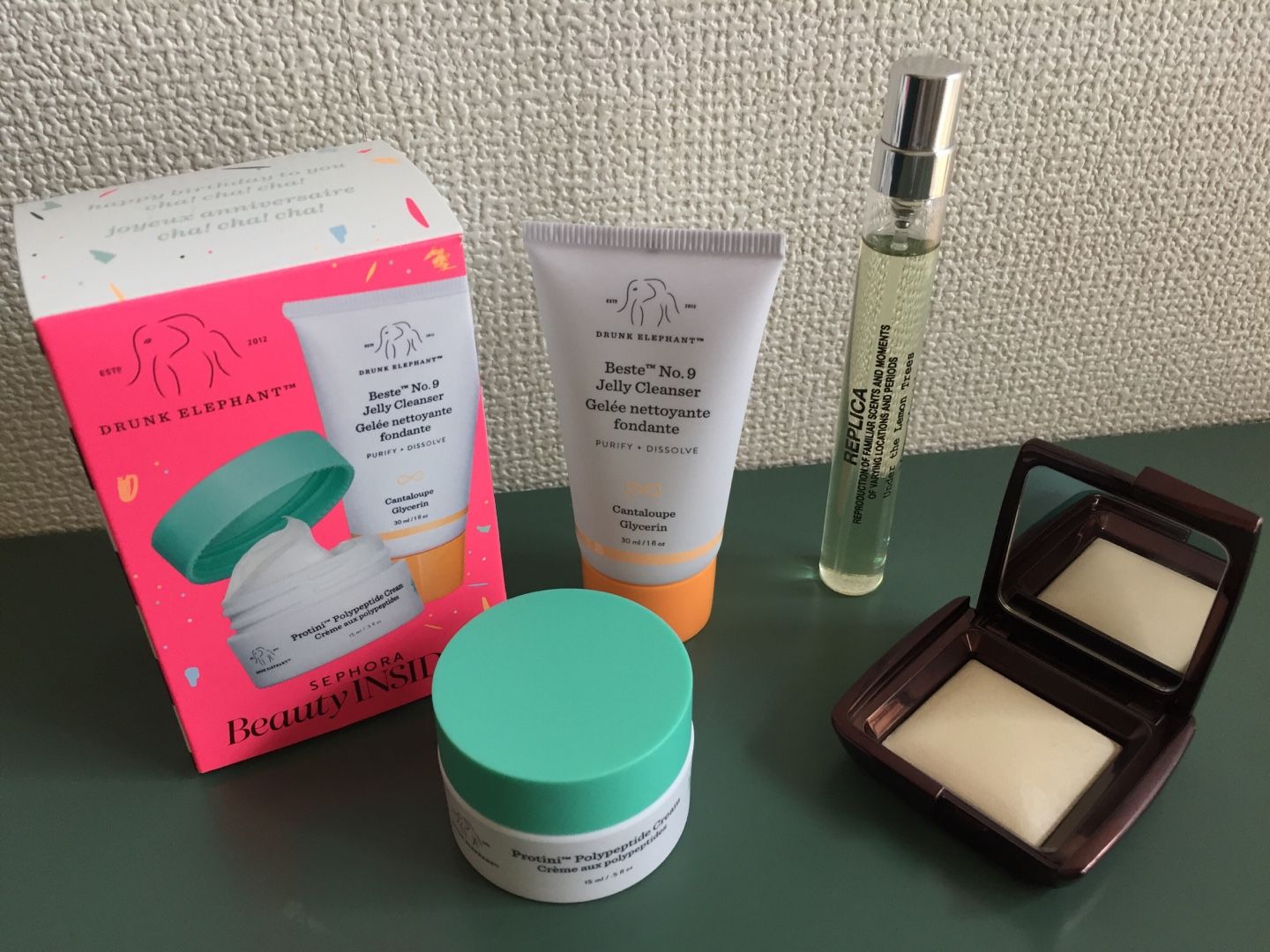 アウトレットで コスメを沢山ゲットして🕺 満足してしまったので 大好きSEPHORAでは 2点のみ購入しました✨ メゾンマルジェラの香水🍋 とアワーグラス の ミニパウダー でもお誕生日月だから ドランクエレファントの スキンケアセットを貰ったよ💕 全て初めて使うものばかり なので とても楽しみです😆
