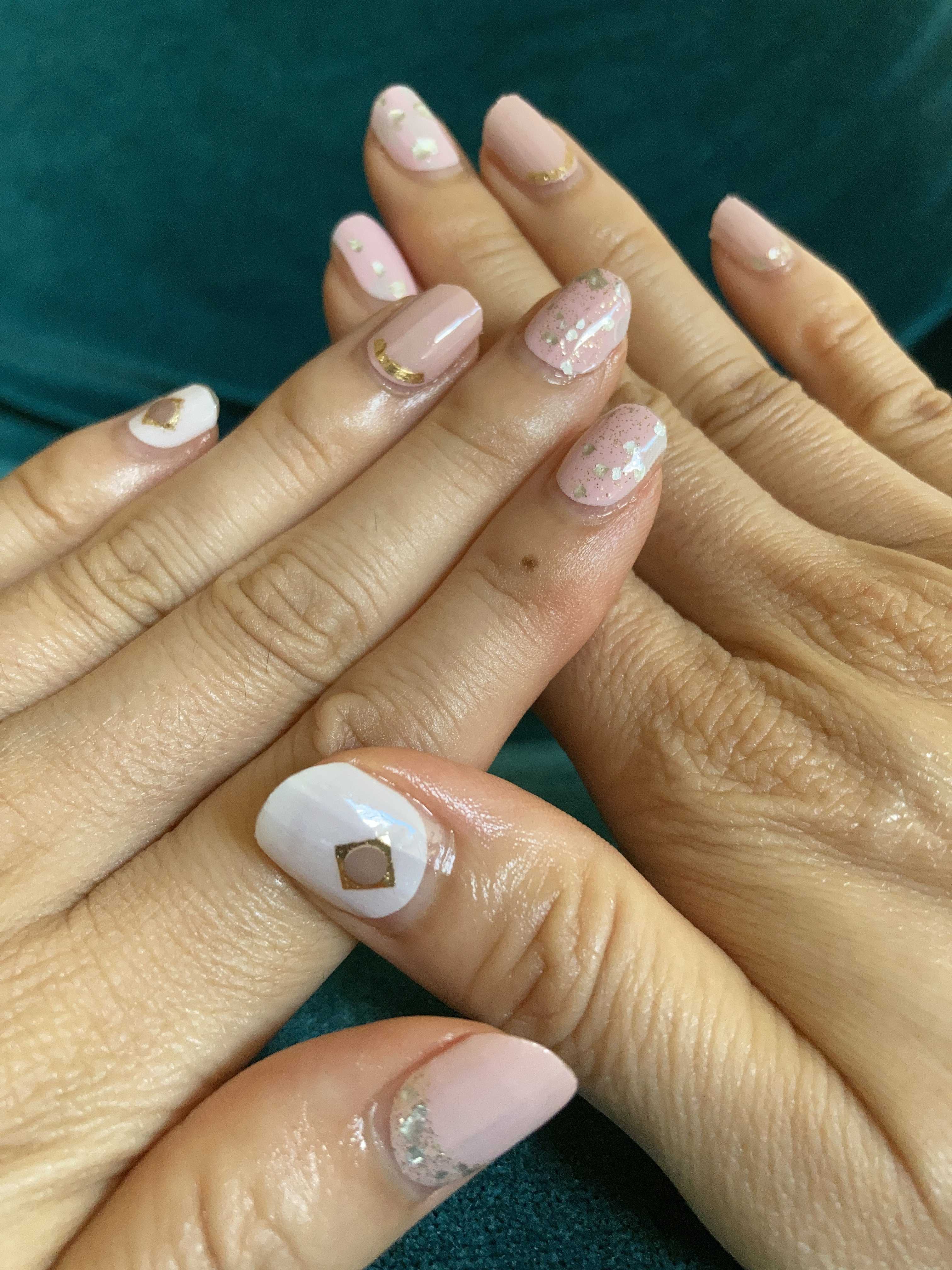 いつものQoo10で買った1枚100円位のネイルシール🌈ジェルで硬化して仕上げればそこそこいい感じ😃剥がすのも簡単やしおススメです❣️