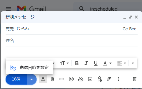 メールを送る「送信」を押さずに、その横の▲を押して、日時を指定するだけです。