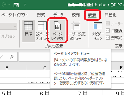 メニューの「表示」から、「ページレイアウト」に切り替えるだけです。大笑い