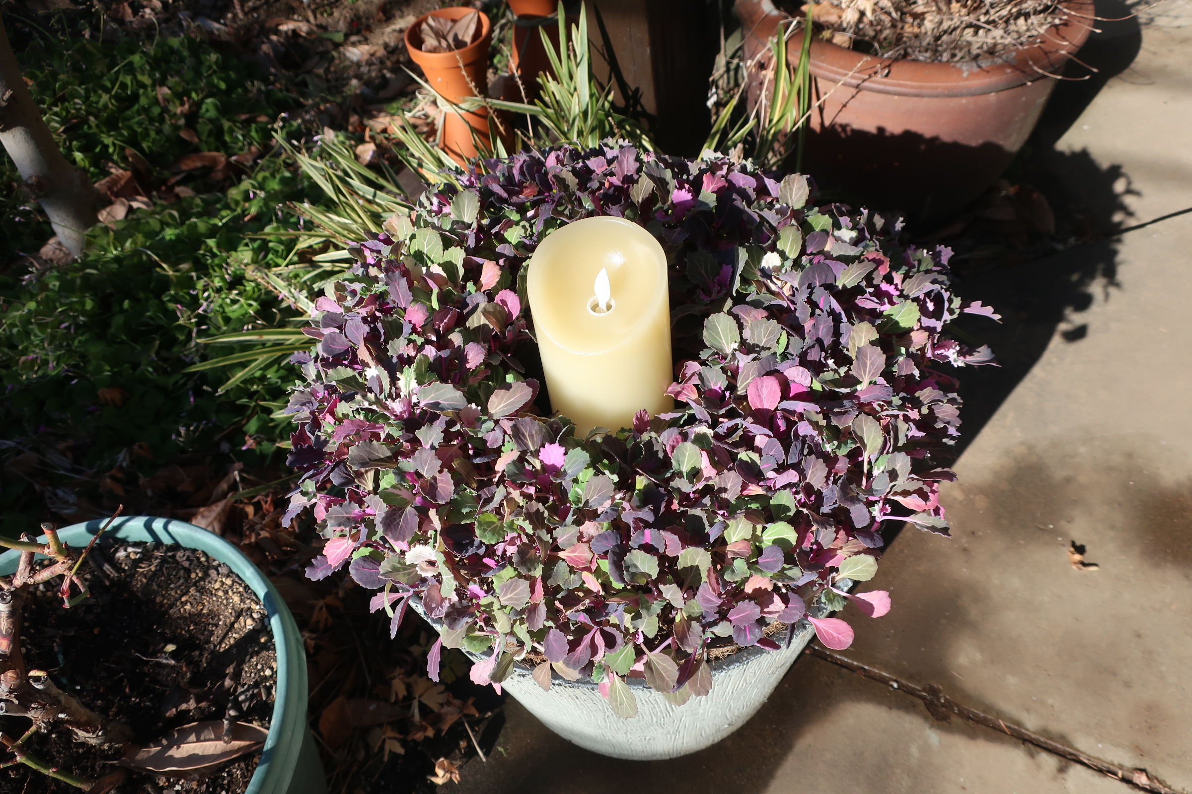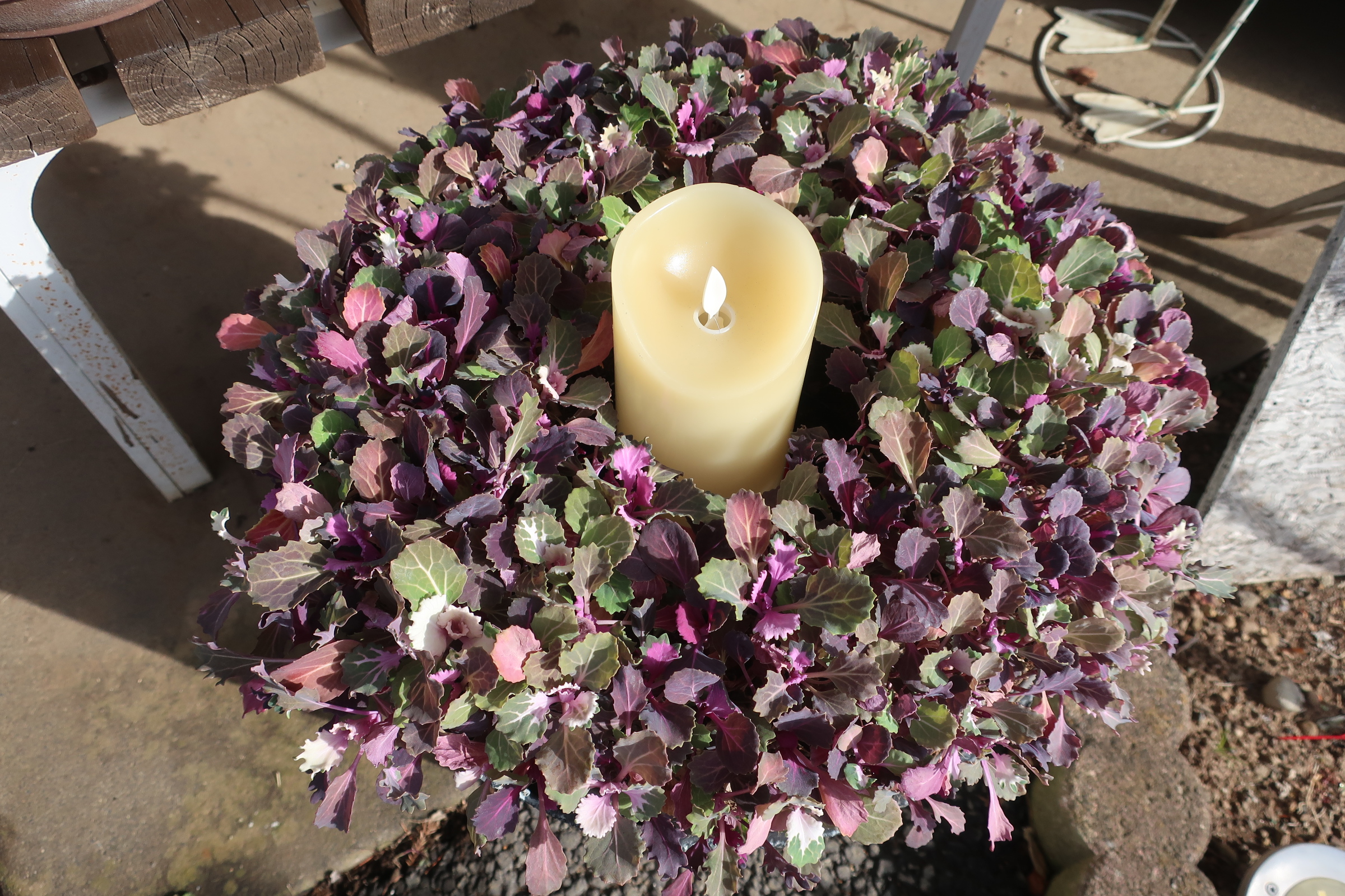 寒い・・・・・寒いよ・・・・・今日は「全国的に冬本番」って言ってた。当地の朝は、マイナス7度だった。 え〜、夏が長かったんだから、冬は遅くていいのに〜。寒さに強いハボタンでさえ、外に出しっぱなしでは傷むので、夜は物干し場に避難させている。多粒蒔きのハボタンリースが、いい色になってきた。次男の送迎に合わせて外に出している。写真には白い葉っぱがあまり写ってないが、白もあるんだよ。真っ暗になると写真に写せない(そんな腕がない)から、夕方撮ってみた。人間の目には、それなりに見えるんだけどね。夕方6時になったら取り込んで、物干し場に避難させているが、今朝はそこに置いているメダカ鉢の表面が凍った。🥶😱下まで凍るわけではないから大丈夫だけど、ホントに嫌な季節がやってきたよ。😫😮💨