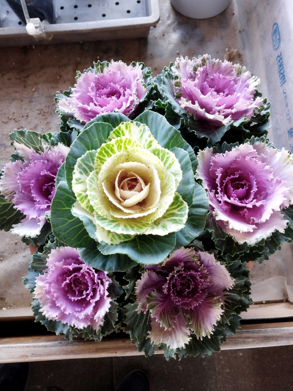 去年の10月に、道の駅で見たハボタンの寄せ植え。6株〜7株のハボタンだけを、丸いコンテナに寄せてあった。葉っぱの形状がそれぞれ違う。これを種蒔きから自分でやりたくて、ハボタンの種を蒔き寄せ植えを作った。だが、全然巻き巻きにならなくて、イマイチな寄せ植えになった10月。それが今、少〜し葉っぱが巻いてきた。虫食いのもある。(笑)葉脈がグリーンのもの。中心が紫のもの。これも紫。全体としては、こんな感じになった。 13株植えてある。外に出しっぱなしでは葉っぱが凍みるので、昼間のいっときだけ外に出し日光浴、ほとんど物干し場で過ごさせている。ちょっとは見てくれが良くなったよね?✌️ここから更に巻くか? これが最終形態か?来年は種蒔き時期をもっと早くしよう。 そしたらもっと早くに巻き始めるだろうから。(来年もやる気か? 笑)