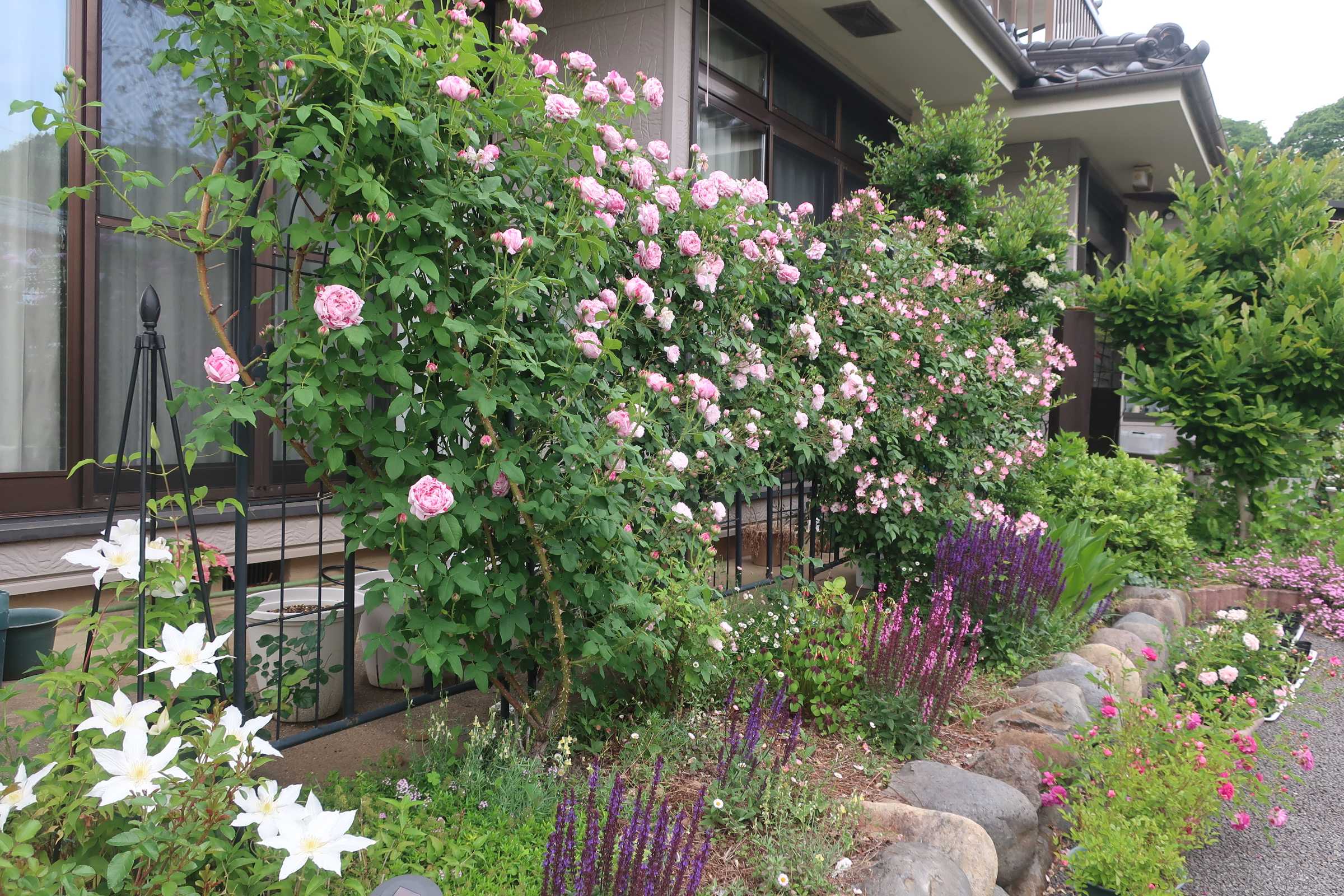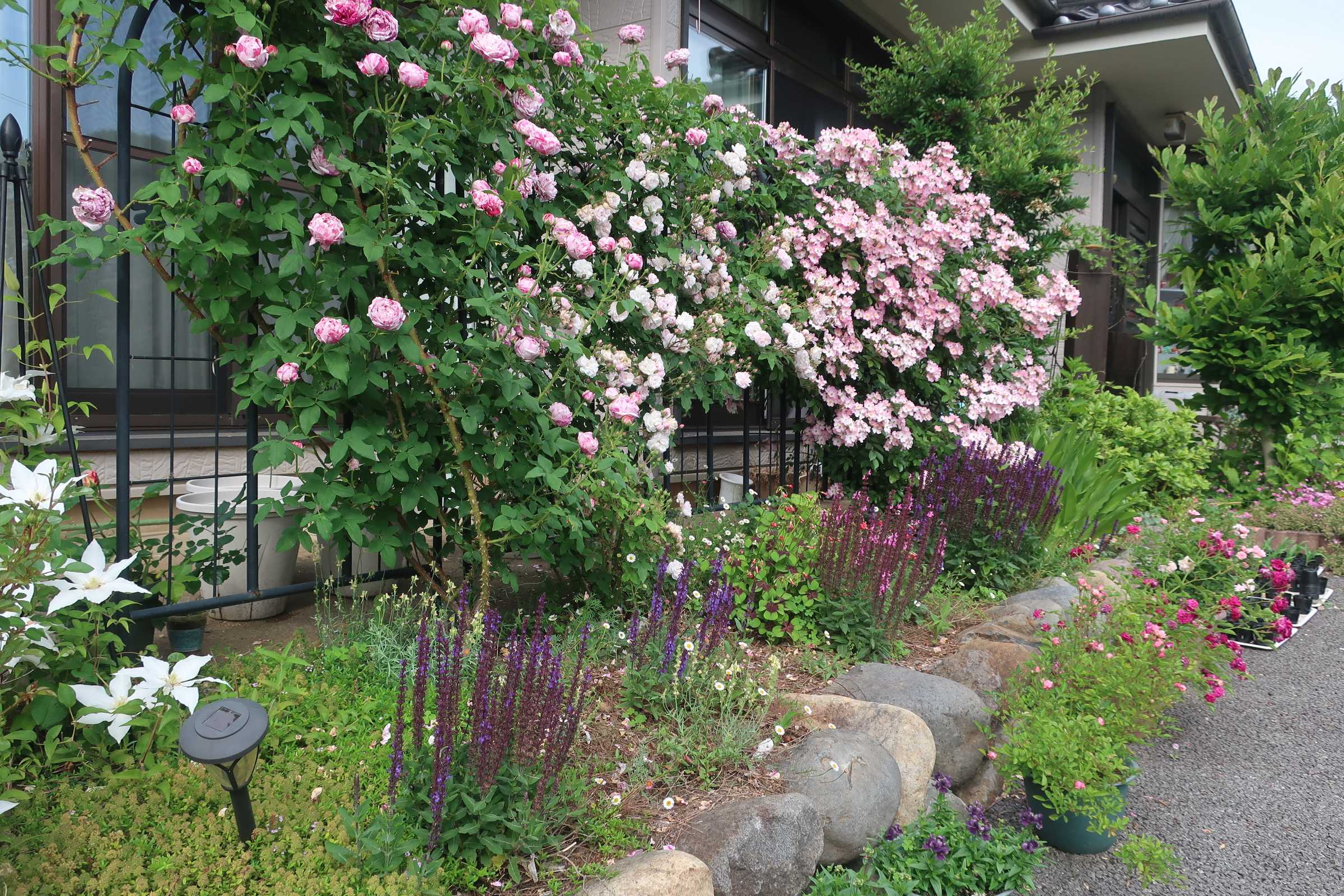 梅雨入りまで、既にカウントダウンしている当地方。バラが爆咲き寸前だけれど、雨に当たっては台無しなので写真を撮った。ここは少しピークを過ぎたフロントガーデン。何しろヴァリエガータ・ディ・ボローニャとブラッシュ・ノアゼットの花持ちが悪いので、次々と咲いて崩れていく。右側のバレリーナの、花持ちの良さで保たれている。いつもならピンクの壁になるブリーズ・パルファンが、半分咲いて半分蕾状態。気温の乱高下のせいでしょうかね?手作りアーチの反対側のルージュ・ピエールさんは、珍しくボーリングせずに形よく咲いた。やはり半分は蕾なので、爆咲きでないのが残念。裏手のリシュリューが、やっと満開。今が一番いい景色。家の裏に誘引した、挿し木のブリーズ・パルファン。けっこう大株になってきた。大好きな赤いダブリンベイ。これまた疎らに咲いている。挿し木のクリスティアーナ。 挿し木して3年目、ちょっと本気を出してきたみたい。ローブリッターも、あと少しで満開。もう数日は、雨になってほしくないのだが・・。左からロイヤルサンセット、中央がパブロワ。そして満開のアンジェラ。今年は緩く誘引したので、花が密集しなかった。 遅咲きのバラはまだ蕾なのに、天気予報は明後日から梅雨並みの雨らしい。ん〜〜〜、毎年「やったぁ~」とはいかないや。🙄💦でも、通りがかりの車(多分、道を間違って入って来た)に乗ってた女の子が「うわぁ~キレ〜イ!」と叫んだのが聞こえて、草取りをしながらニヤけてしまった。😆