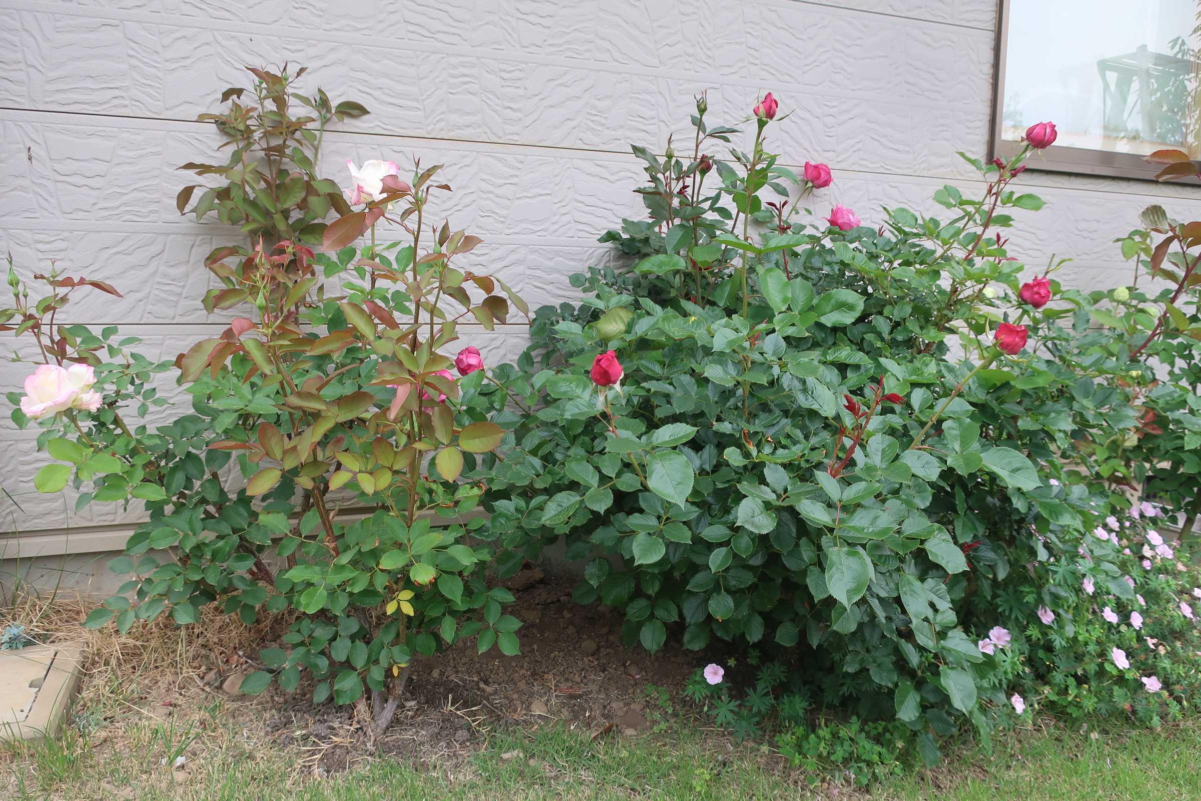 昨日はザンザン降りの雨で、気温も18度(耐寒はもっと寒かった)今日はピーカンの晴れで、気温はぐんぐん上がって28度。😫こんなに気温差があると寒暖差でグッタリする植物が多く、鉢植えのものは物影に避難させたが・・。💦雨が花弁に溜まってゾンビになったバラを切り、雛が巣立ったのでロシアンオリーブの伸びすぎた枝を切り、斑入りノブドウに日が当たらないからヒメコブシの枝を切った。はい、夢中でやったので、写真がありません。(笑)なので、今日のバラをアップしてみる。東側の軒下に植えているバラ。左は、魅惑。大輪のバラで、この状態が一番美しい。 ここを過ぎると、大きすぎてバランスが悪くなる。右は、切り花品種のパヒューパープル。花持ちよく、香りのよいバラ。こちらも、切り花品種の2つ。左が、モンシュシュ。花持ちはよいが、ほぼ香り無し。右が、フェアリーカップ。この子も花持ちはいいが、香りは無い。これはミニバラ、〇〇アイって名前があるんだけど、タグを無くしたので思い出せない。💦 ←思い出した!チェリーアイ。😁