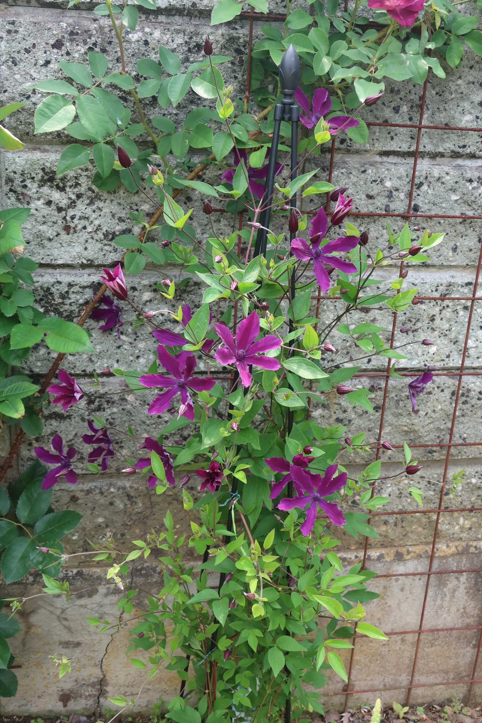 今日は雨予報から一転、午前中は晴れ・・からの強風・・からのどんよりモワッとした空気・・たぶん夜にはにわか雨?らしい。梅雨入り前に写真撮らなきゃと、庭のクレマチスを撮ってみた。アフロディーテ・エレガフミナ。自力で掴まってくれないから、時々誘引しなきゃいけないのが、実は面倒くさいが、今年はたくさん咲きそうだ。パルセット。この子も、自力で掴まってくれない子。😮💨 オマケにいつもショボい。💦プリンセス・ダイアナ。濃いピンクが可愛くて、大好きなんだけど大暴れする。去年友達からもらった挿し木の、ベノーサビオラセア。 まだ株が貧弱だから花も小さい。 本来は大輪で咲くらしい。挿し木の、ポーリッシュ・スピリット。元株が、今春突然枯れた。😱 良かった、挿し木しておいて。😅かなりビッシリ咲いたポーリッシュ・スピリットだが、後ろの群生の迫力は段違い。(笑)明日の雨で痛む前に、隣の畑のおばさんの群生をもう一度。梅雨入り前にと、今日はせっせと草取りしたが、雨の恵みでまた草が茂るんだろうなぁ~。今年も雑草との根比べ。 いつも負けてるけどね〜。🤣💦