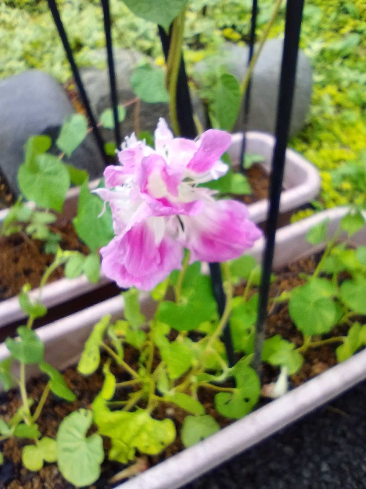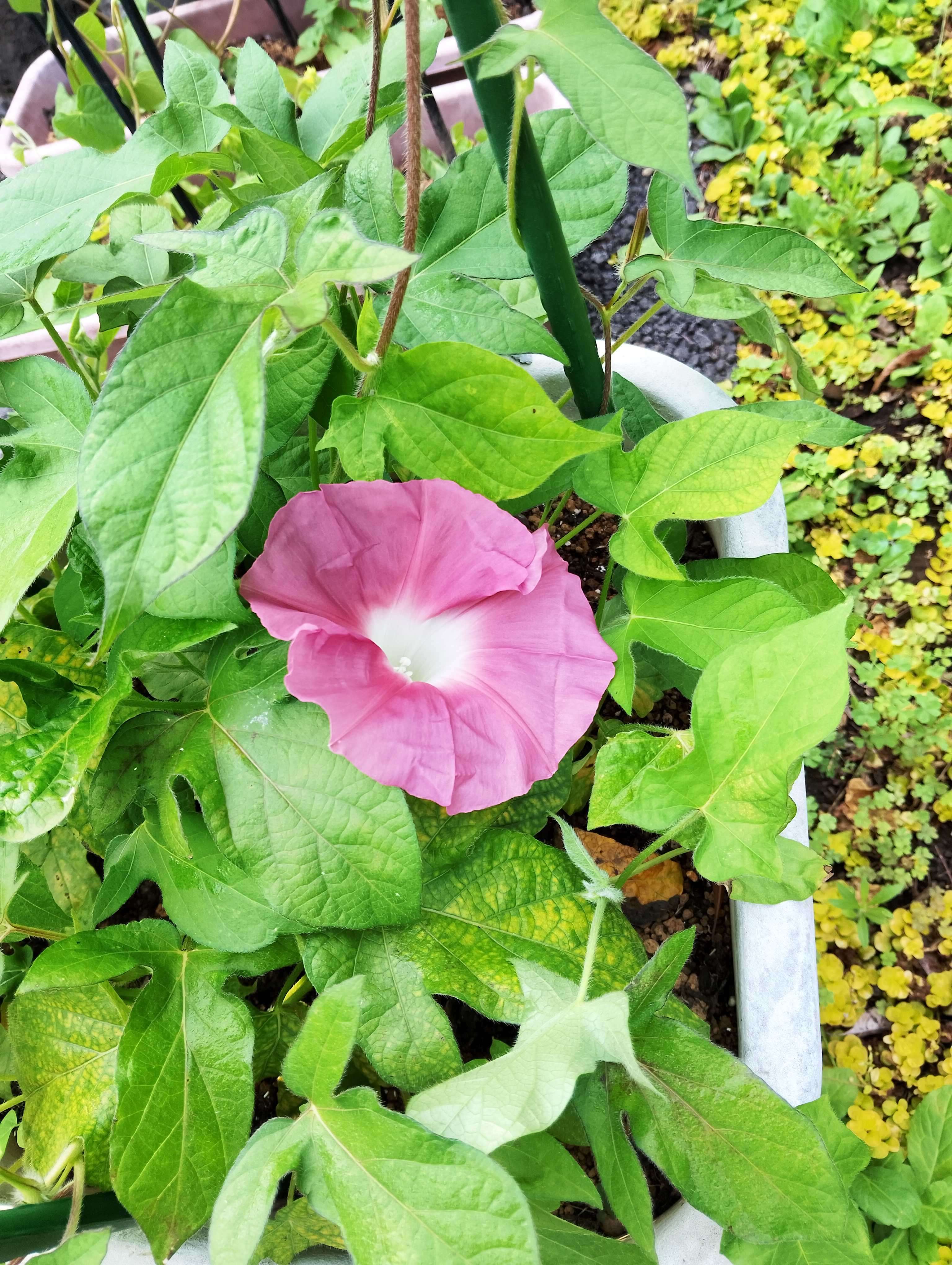 大雨の翌日の今日は、曇り空。時々陽が差したり、ポツポツと雨が降ったりの不安定な一日。 こんな日は休息日だと思って、何もしない。 たまにはいいじゃないか。😄朝、倒れた物を起こしたり、写真を撮った後、朝顔を覗いたら・・。ついにスプリットペタルが1輪、イメージ通りに咲いていた。😍横から見ると。株違いのスプリットペタルは、相変わらず。(笑)あとは白いスプリットペタルが咲くのを待つのみ。 まだツルが30センチくらいだから、蕾はとても小さい。楽しみに待とう。🤗