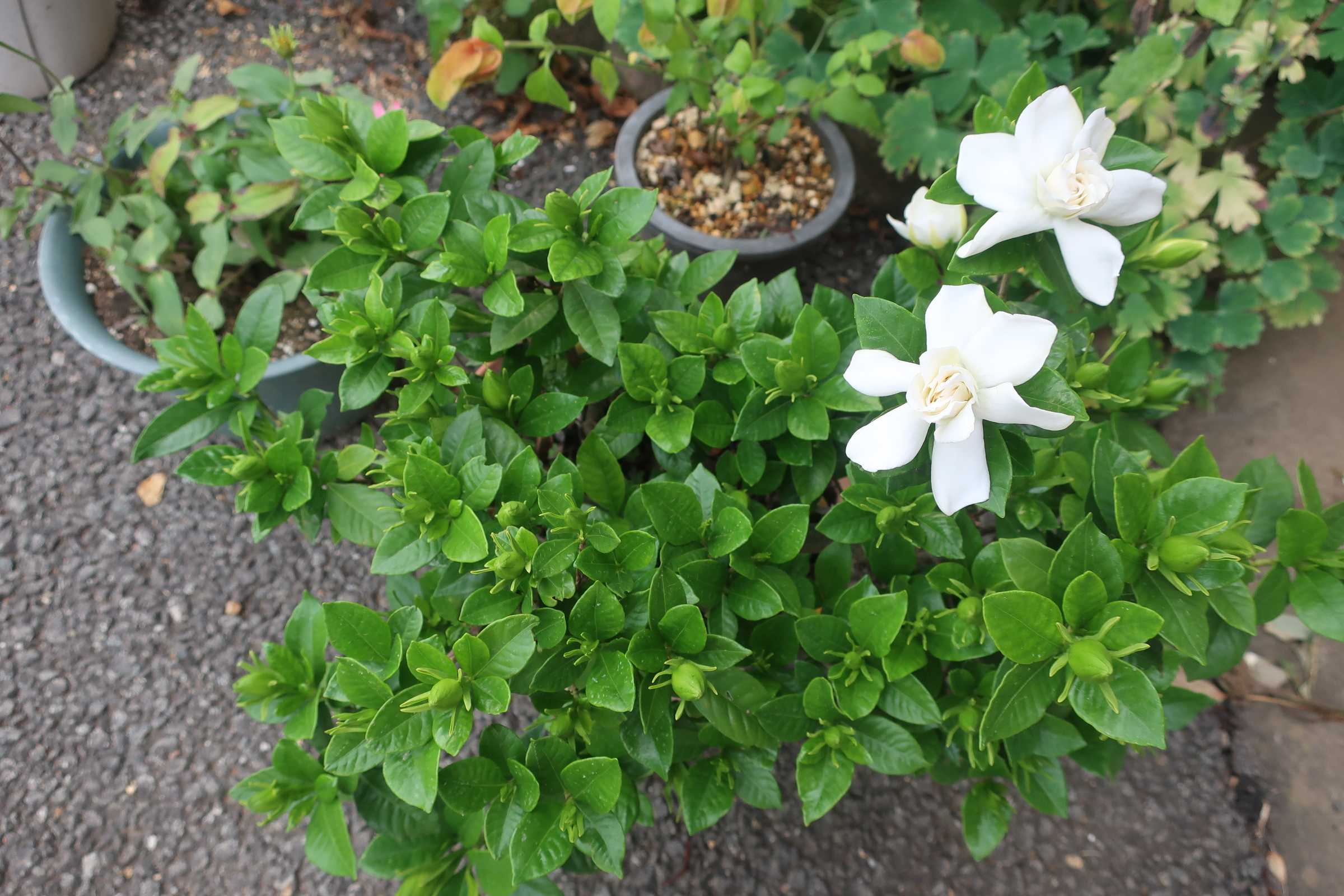 今日の朝、玄関を出ると真っ白なものが目に入った。昨日はまだ緑の蕾だったハズ。昨日が暑かったから、急に咲き進んだのかな?真っ白な花と濃厚な香りのクチナシが、2輪咲いていた。 これが咲いたら夏だね。この花も当地では越冬出来ないから、鉢植えにして冬は寝室組だ。大きくしないように剪定して、同じ鉢で秋に土替えしている。今朝、2輪目のスプリットペタルが咲いた。正面から見ると、やはり普通の朝顔。でも横から見ると、スプリットペタルの片鱗があるのよ。😉次の花に期待!!今日の庭仕事は、挿し穂を作って苗を増やす作業をした。まずは5月に、苗で買ったペチュニア。特に名前のないペチュニアなんだけど、ピンクの中央にグリーンが入っていて、気に入ったの。伸びてきて姿が乱れたから、思い切ってバッサリ。😱ラッキー7で、7本の挿し穂を作ったよ。✌️そして、先日やっと気に入ったコリウスを見つけたので、この2つを買って伸びるのを待っていた。(赤い方がランデブー、緑の方がピーター・グリーン)いい感じに伸びた茎をカットして、赤玉土に挿した。ペチュニアもコリウスも挿し穂の活着はいいみたいだから、半日陰で様子を見るつもり。全部ついたら、どこに植えようかな?🤔(取らぬ狸の皮算用中 笑)今日も暑かった。🥵 午前中で庭仕事はおしまい。夕方から遠雷が聴こえたが、夕立は無かった。😥テレビのニュースでは、関東地方は記録的短時間大雨情報が出たらしい。 極端な天気が続いて怖いね、気を付けようが無いけど気を付けようね。