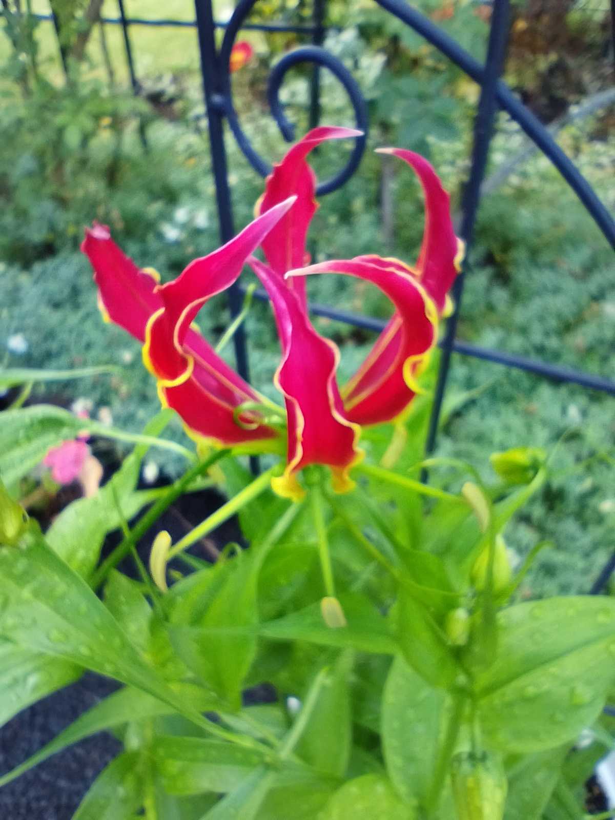 わが家の3番目の朝顔 スプリットペタルの白が咲いたよ〜。白はスプリットペタルの特徴が有るよ。こちらは今日咲いたピンクのスプリットペタル。60センチのプランターを並べ、トピアリースティック2本に誘引している。団十郎。 ちょっと実物に近い色で写せた。下から次々に咲きだして、なつの雰囲気になってきたよ。✌️待ちに待ったグロリオサが咲き出した。一番乗りはグロリオサ・ロスチャイルディアナ。炎が燃え上がっているような花。💕こちらは咲きはじめのグロリオサ。 明日にはそっくり返って、らしい姿になるはず。ロスチャイルディアナではない品種なんだけど、貰った球根なので品種名が分からない。 ロスチャイルディアナよりワインレッドっぽい赤なんだよね〜。🤔