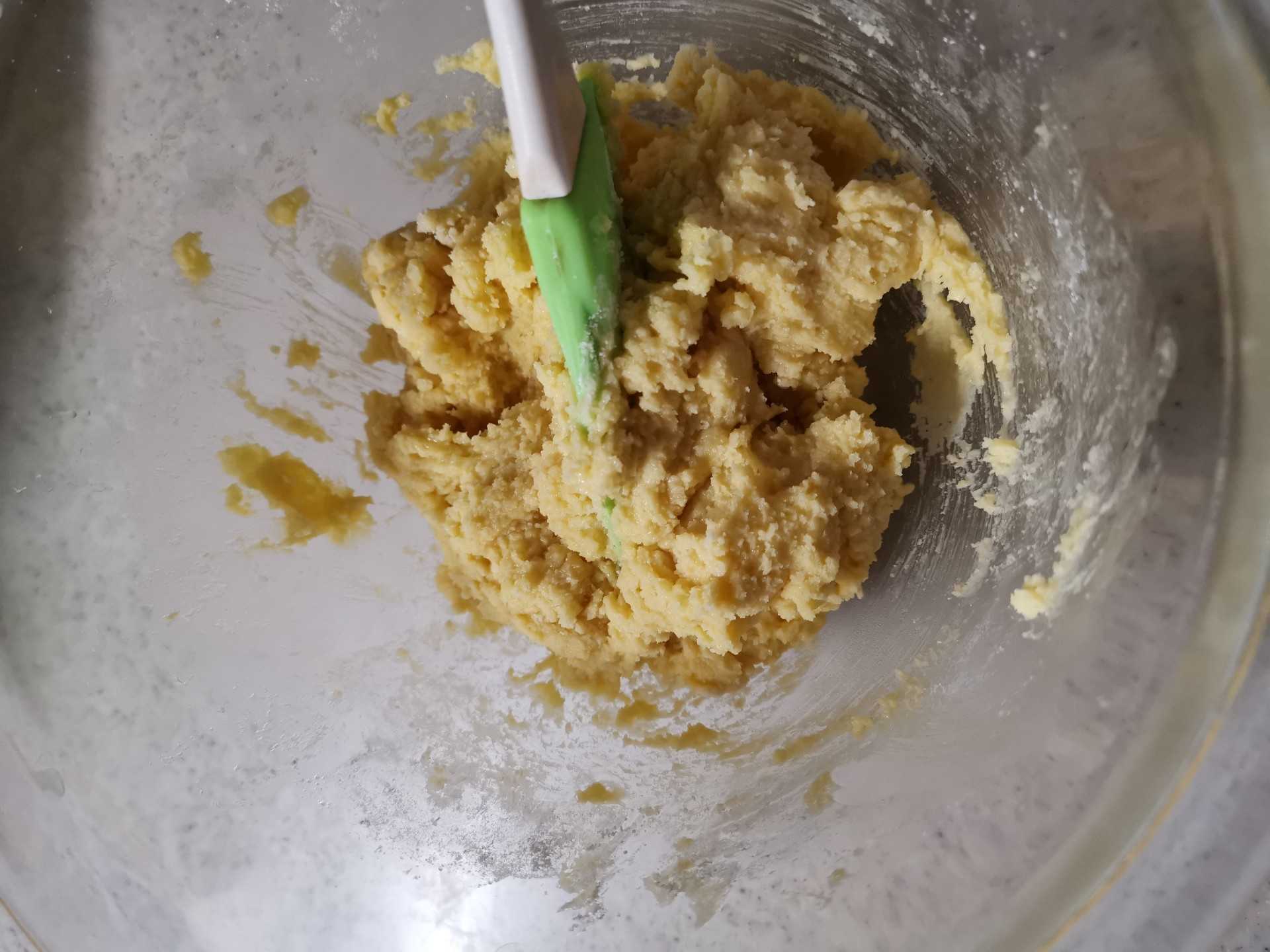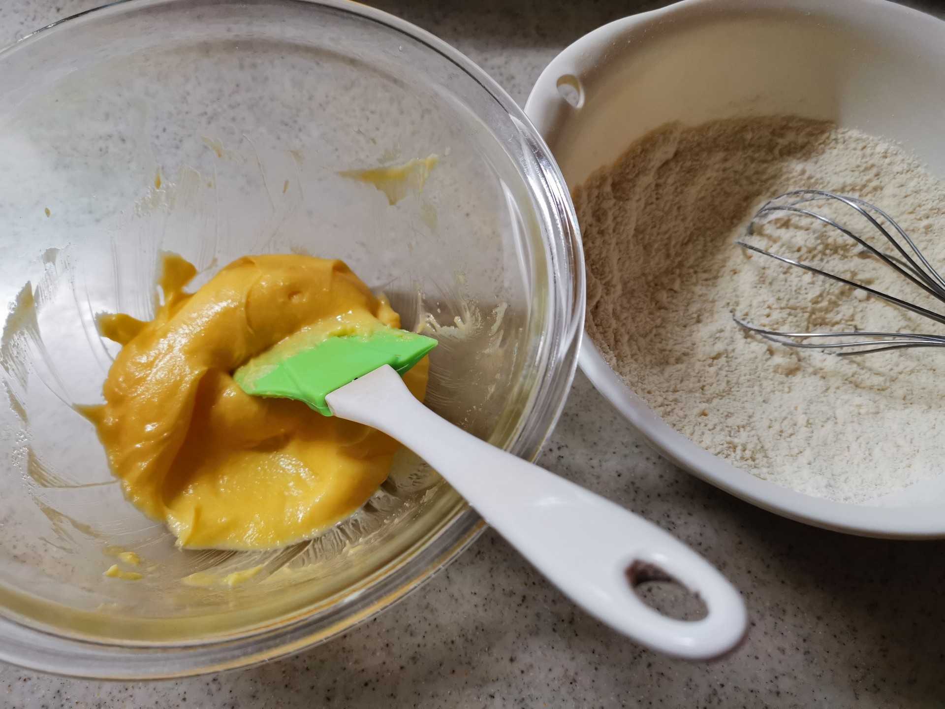 面倒くさがりの私は、相変わらず粉類は泡立て器でよくかき混ぜておくだけですが、ちゃんとする人は、振るっておいてください。これをヘラで混ぜます。スケッパーのある人は、スケッパーで。