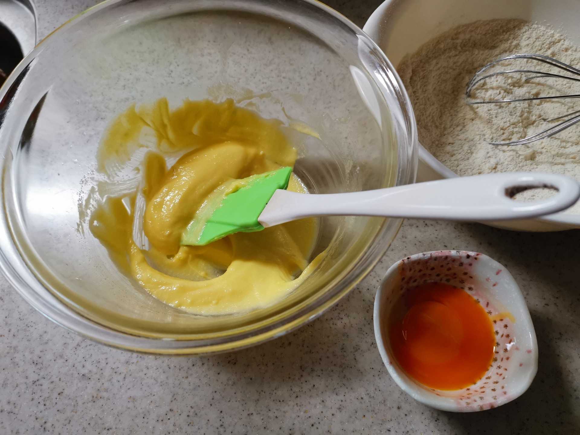 砂糖のザラザラ感が無くなったら、卵黄を入れよく混ぜます。卵黄だけ使って、卵白がもったいない?この場合の卵白の使い道は、我が家では2つ。卵焼きに入れる、シフォンケーキに使う、です。😁