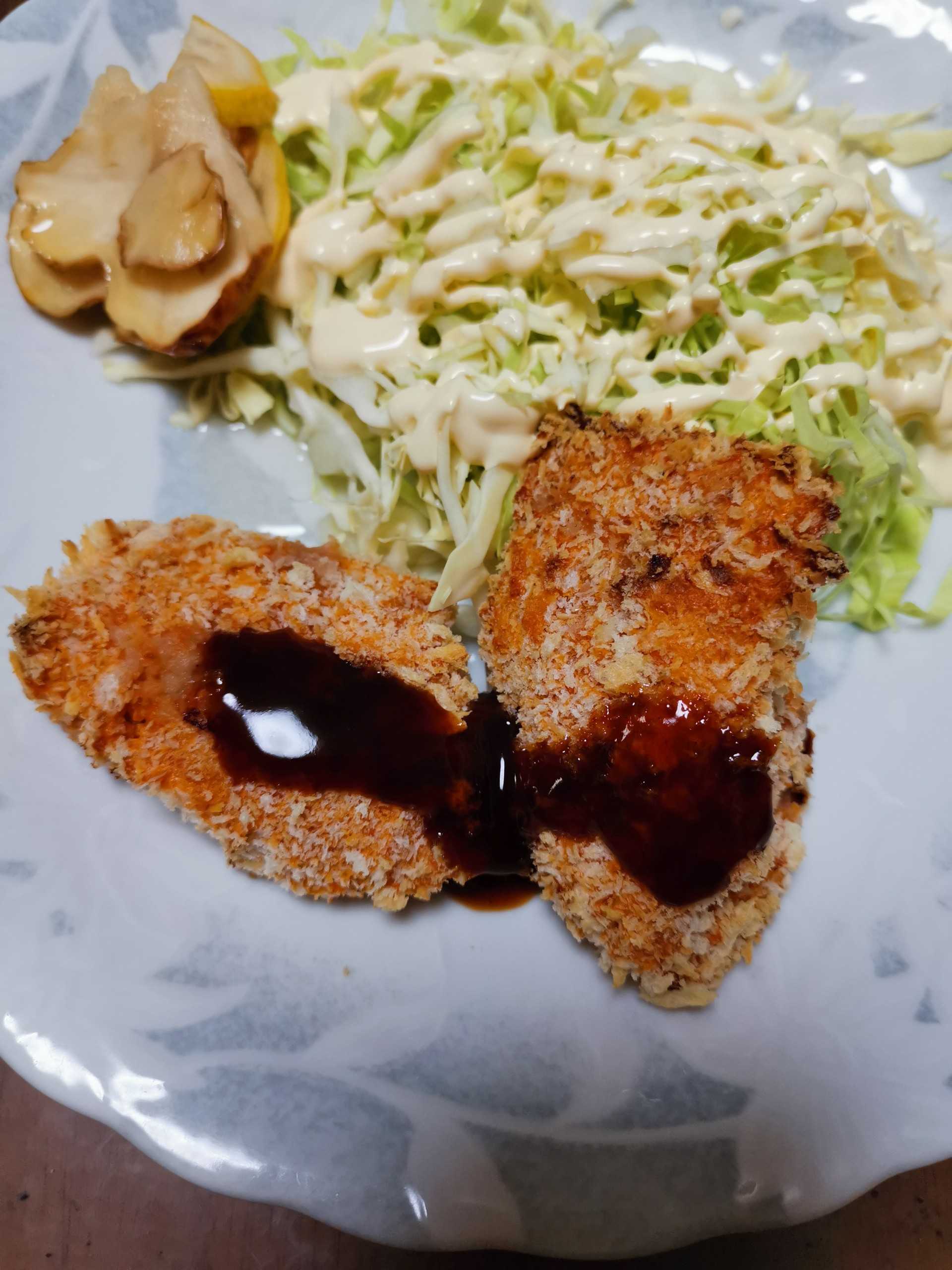 バッター液にサラダ油を足さなかったときの、バキバキ感がない。今日はヒレカツだったけど、ロースカツなら肉自体に油気があるから、もっと違和感ないかも……。