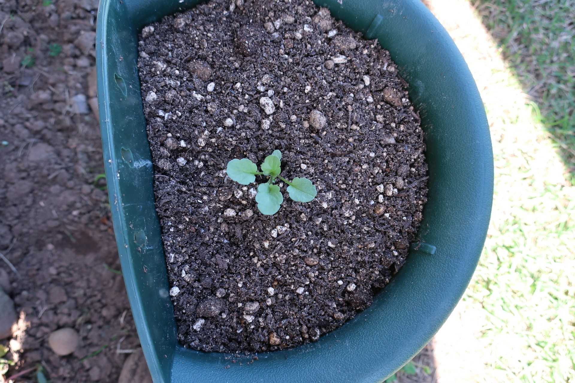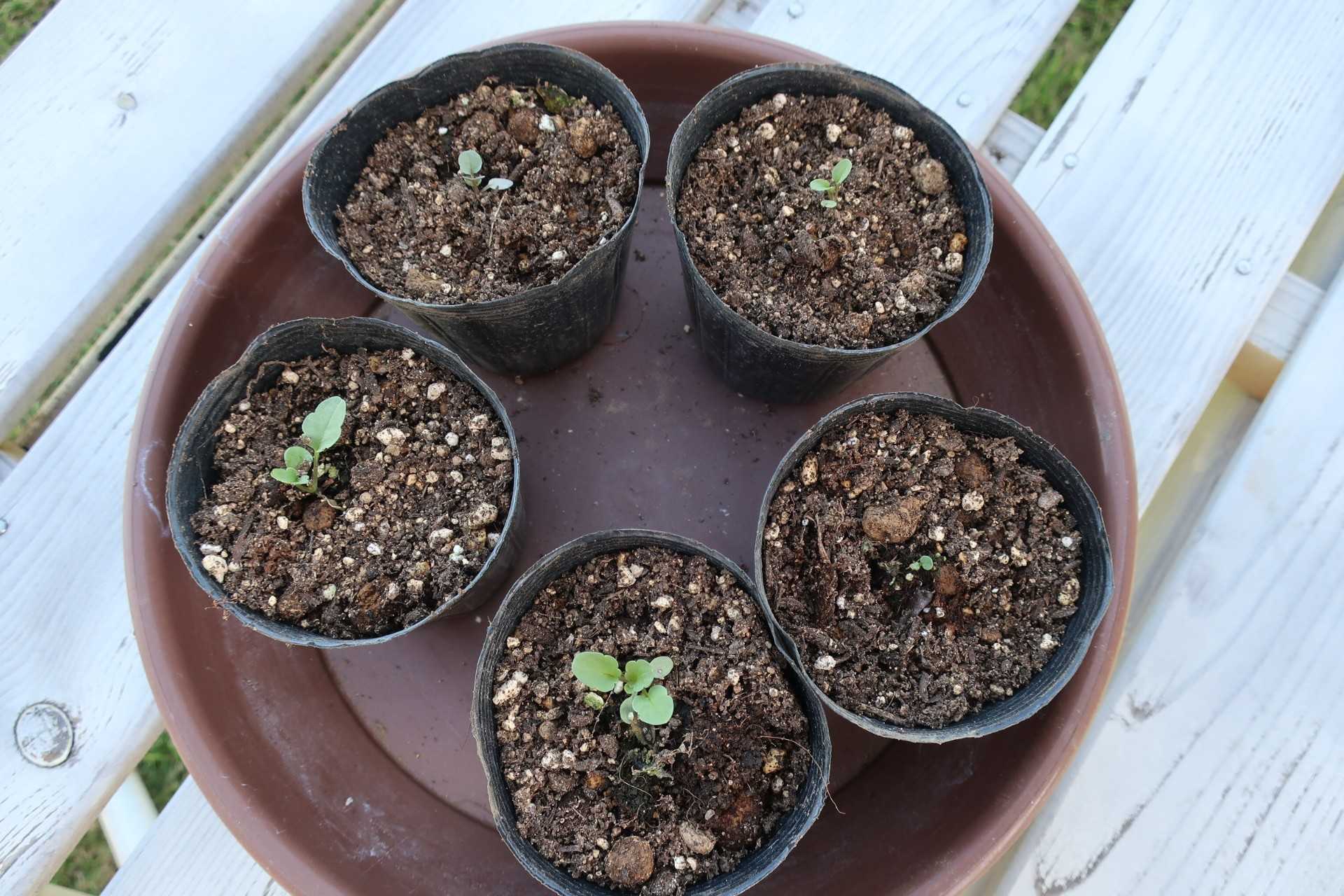 もう1つ、ビオラの鉢があって、そちらもこぼれ種の芽が出ているから、同じように鉢上げとポットあげをしておいた。