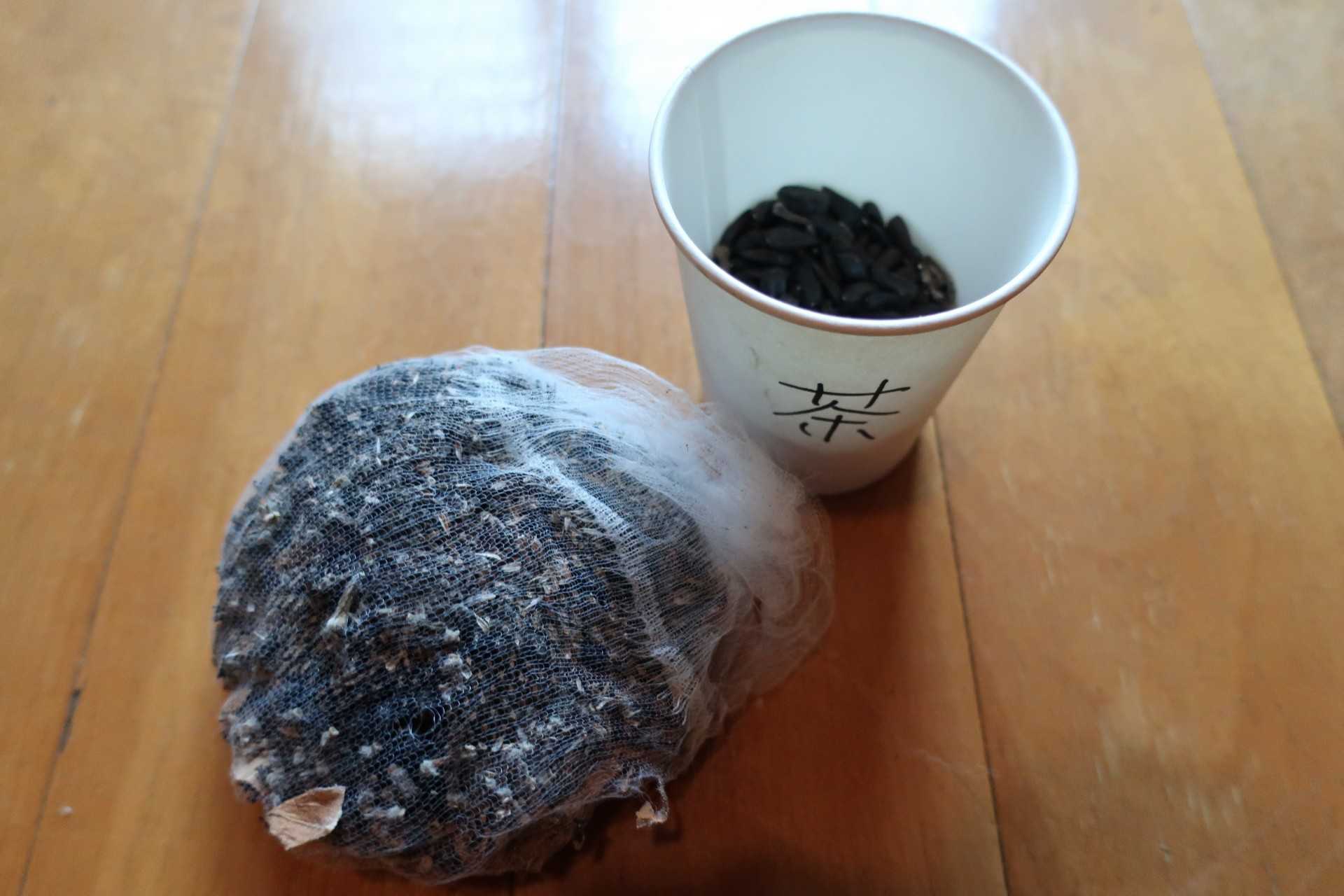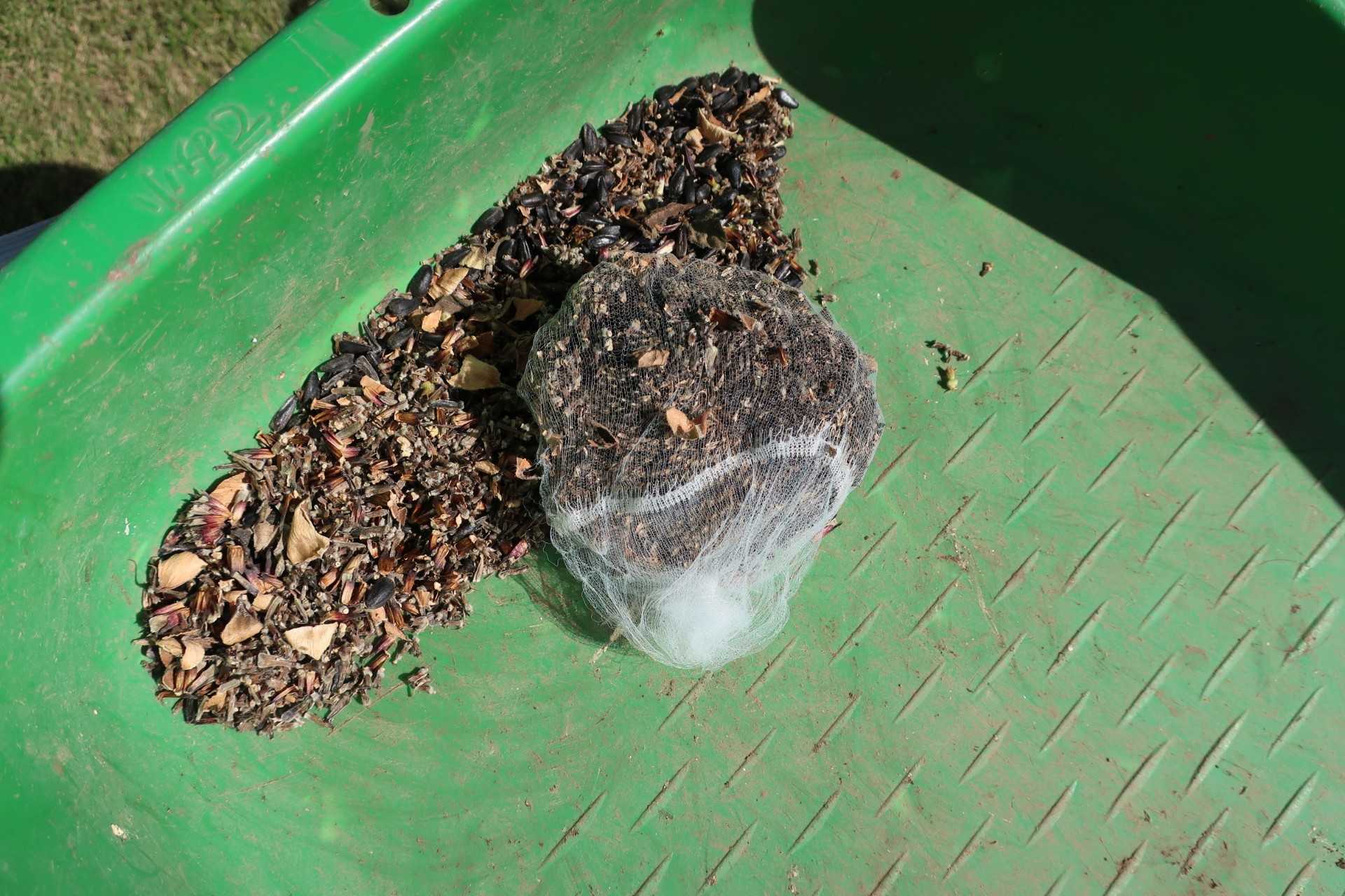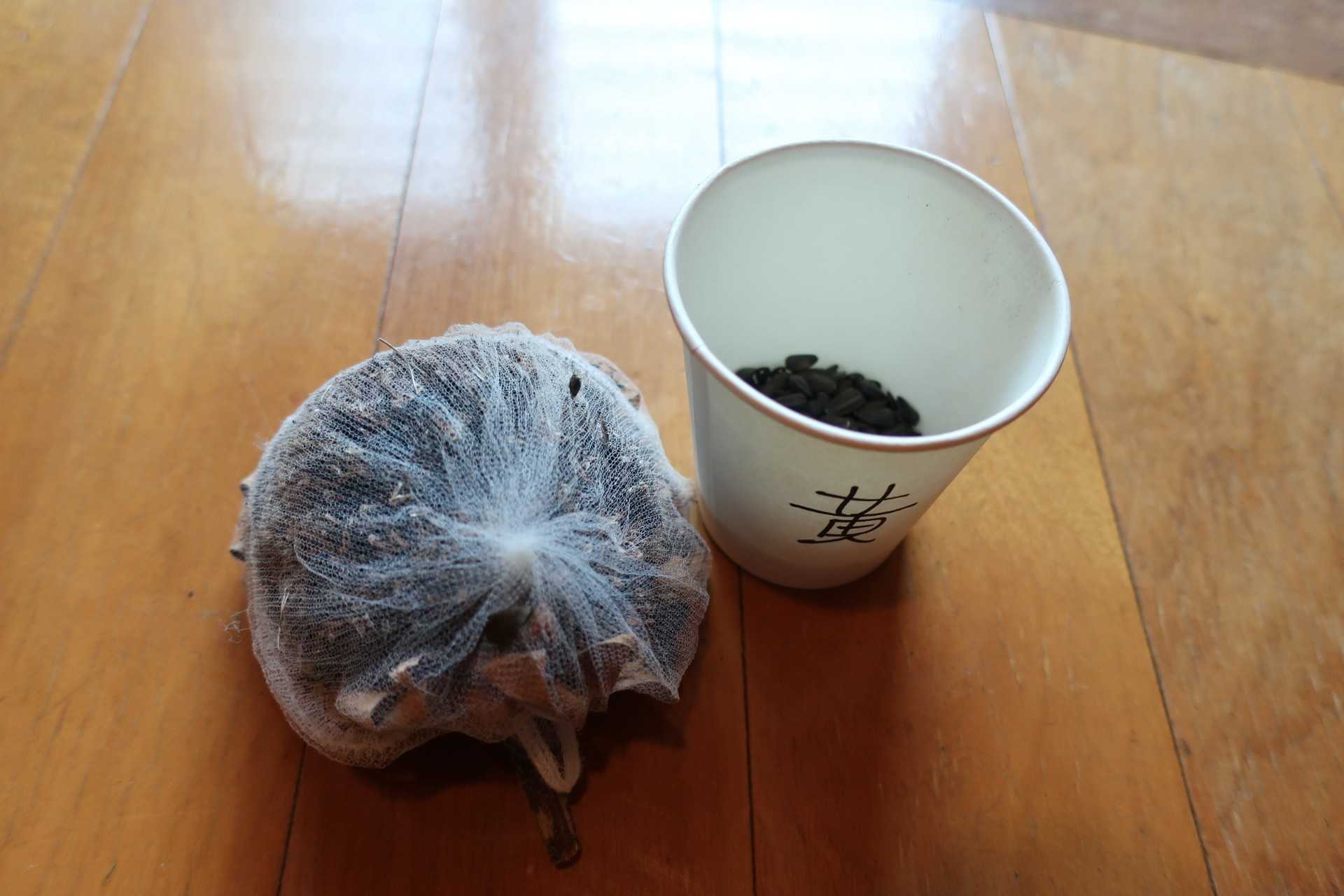 鳥に突かれないように、ネットで覆ったものと、ゴミを取り去って残った種。