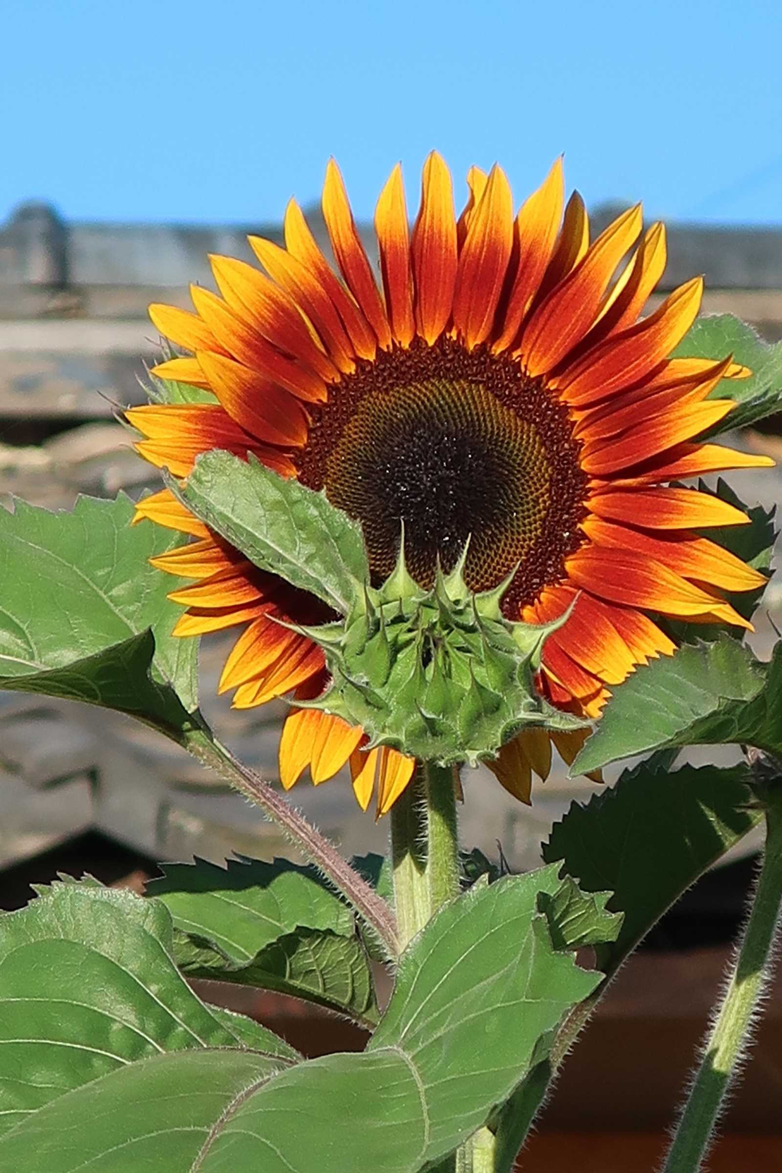 赤と黄色の、ツートンで咲いたムーランルージュ。