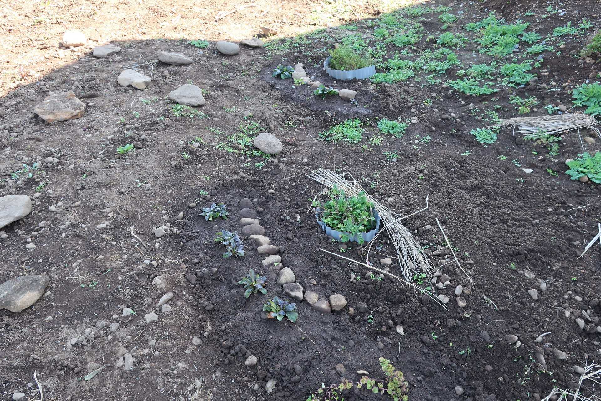 来春、波板を取り外す前提で、石を並べて仕切りとし、余ったアジュガを植えてみた。