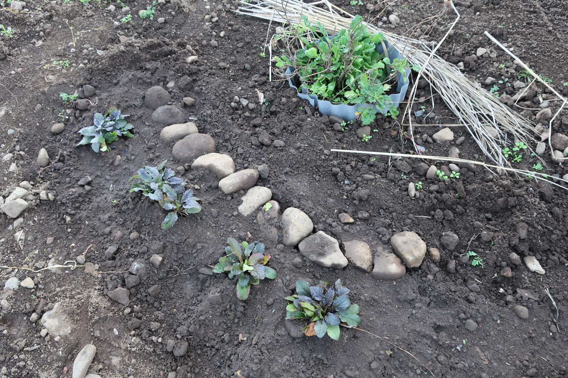 もう1箇所、石を並べて、アジュガを植える。