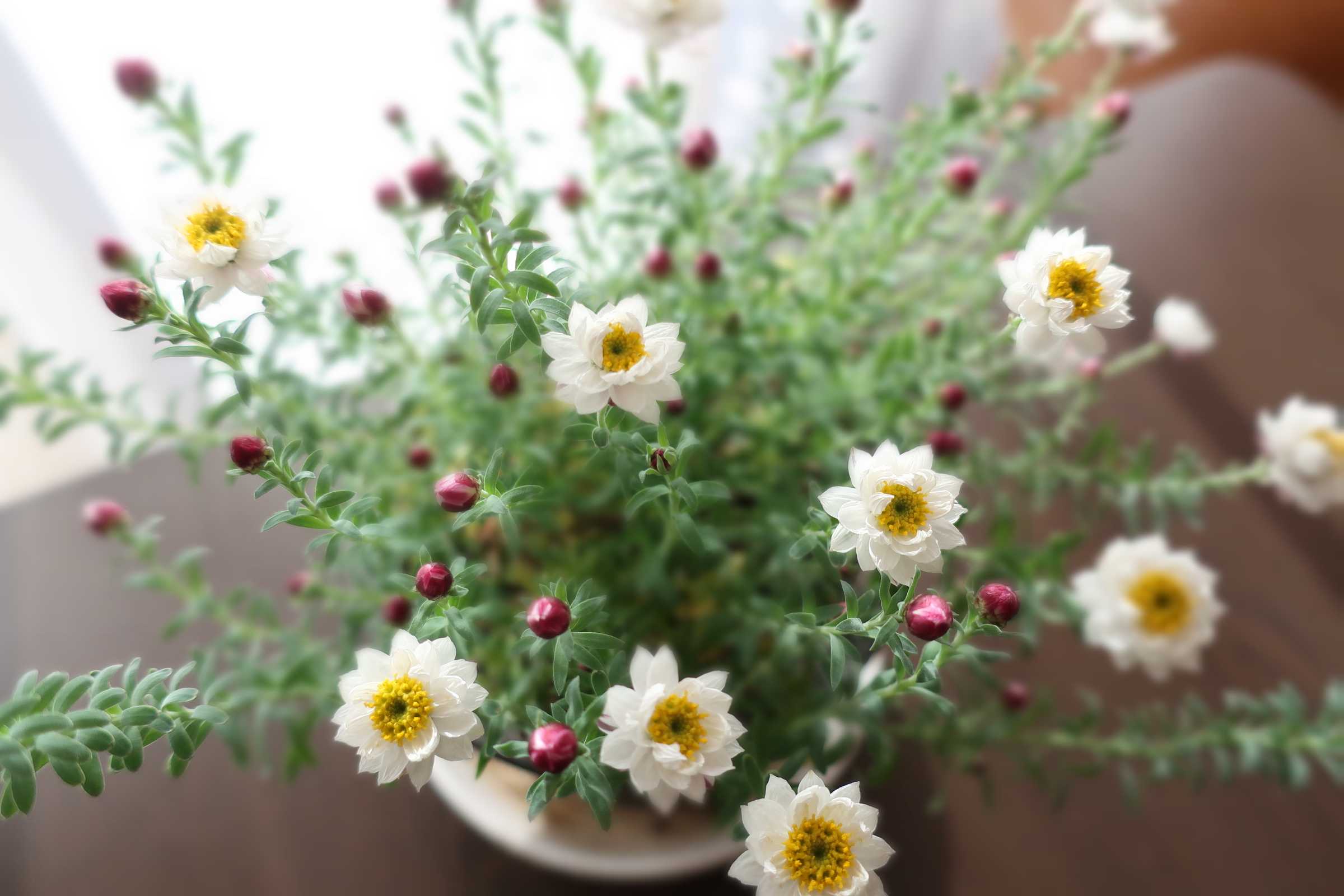 マラコイデスとハナカンザシは、ダイニングテーブルの上に、寄植えは、寝室の日当たりの良い窓際に置いた。